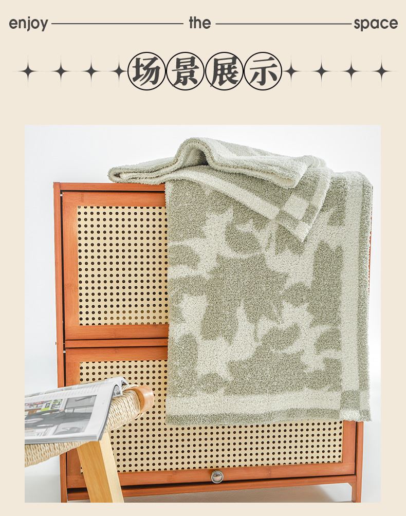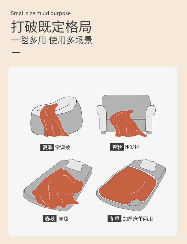7.秋冬季节: 可作为盖毯、披肩毯、沙发毯使用; 春夏季节: 可作为空调毯,户外毯, 露营毯使用。