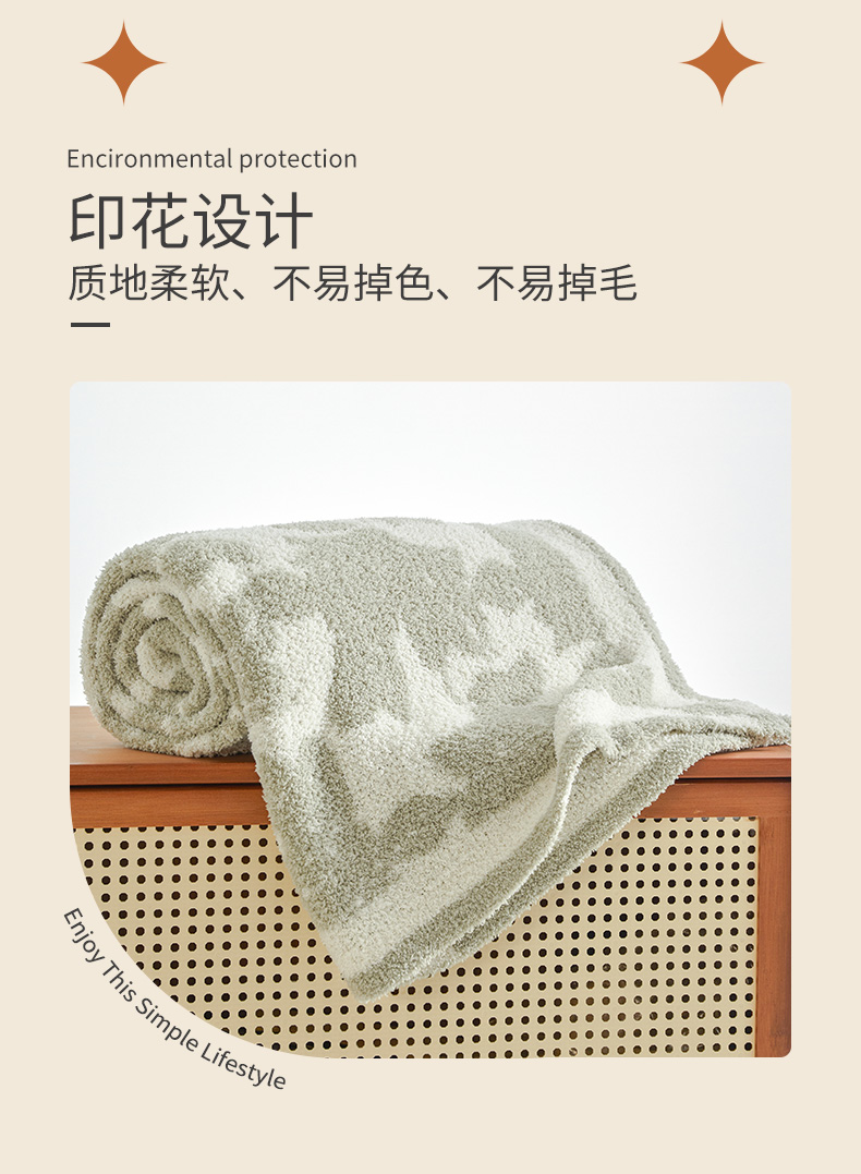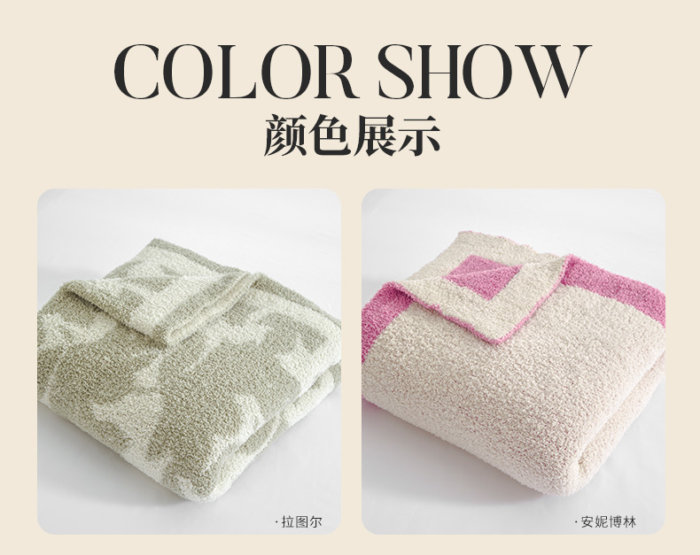 4.长时间使用摩擦,长时间光照, 多次水洗, 沾染汗渍后,均能保持毯子颜色持久如新。越洗越漂亮,久洗不坏; 5.从手感来讲,毯子柔软性好、蓬松感强、面料弹力高, 能快速散热、拒绝闷热 , 既简洁,又耐用;