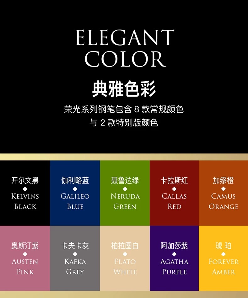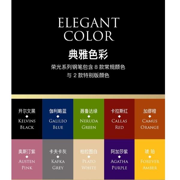 型号:荣光系列墨水笔 类型:螺纹上上墨式墨水笔 重量:墨水/宝珠笔43g/47g 颜色分类:开尔文黑/卡拉斯红/奥斯汀紫/加缪橙/伽利略蓝/卡夫卡灰/柏拉图白 书写粗细:F尖 套餐类型:官方标配 包装方式:鸿运笔记本礼盒装 适用场景:送礼书写 钢笔笔尖成分:铱金笔 笔尖种类;标准型 适用人群:商务办公人士 上墨方式:旋转吸墨 笔杆材质:金属 笔尖嵌入方式:明尖 笔身纹理:格子纹 墨水材质:非碳素墨水