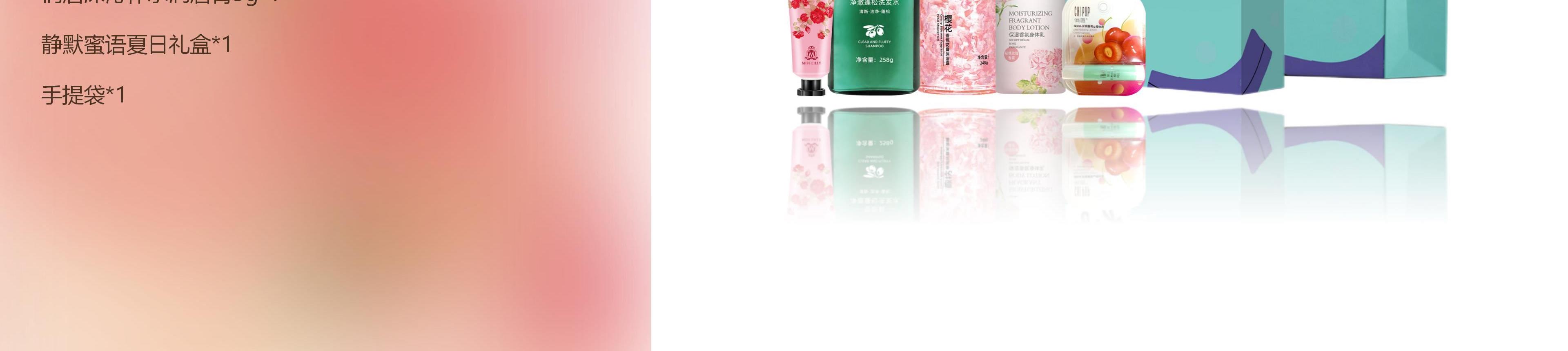 配置:(香型随机) MissLilly蜜斯莉净澈蓬松洗发水258g*1 MissLilly蜜斯莉樱花香氛花瓣沐浴露248g*1 MissLilly蜜斯莉保湿香氛身体乳200ml*1 MissLilly蜜斯莉玫瑰香氛润手霜50g*1 俏唇深沁补水润唇膏3g*1 静默蜜语夏日礼盒*1 手提袋*1