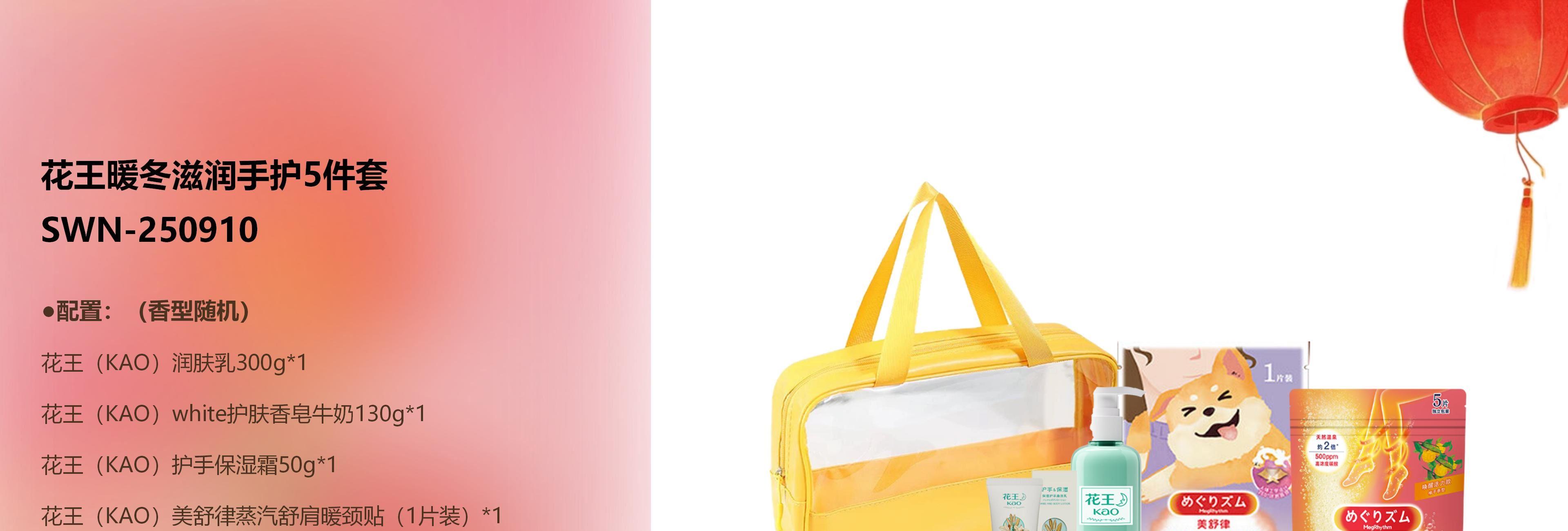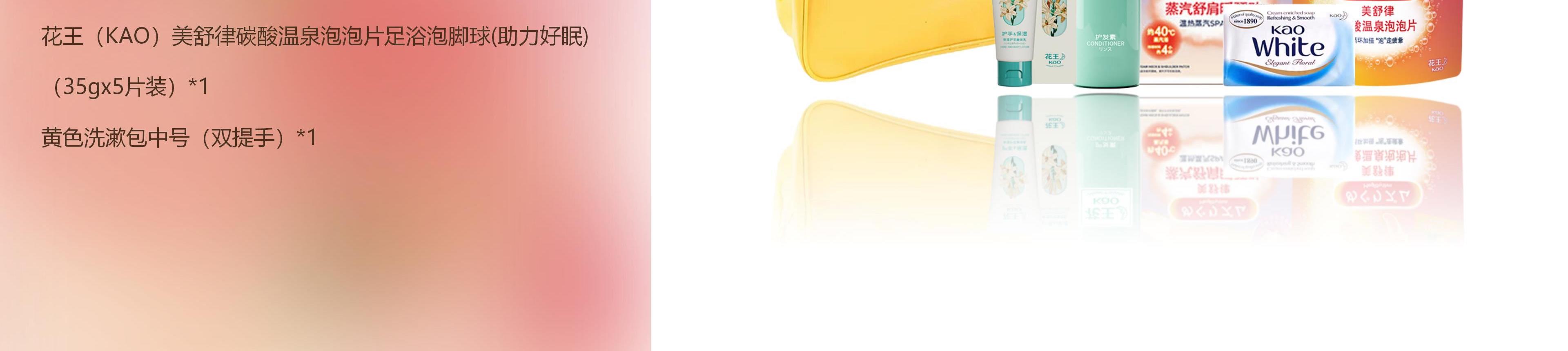 配置:(香型随机) 花王(KAO)润肤乳300g*1 花王(KAO)white护肤香皂牛奶130g*1 花王(KAO)护手保湿霜50g*1 花王(KAO)美舒律蒸汽舒肩暖颈贴(1片装)*1 花王(KAO)美舒律碳酸温泉泡泡片足浴泡脚球(助力好眠)(35gx5片装)*1 黄色洗漱包中号(双提手)*1