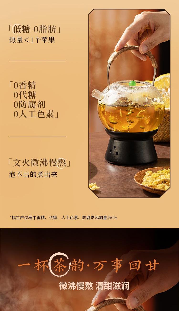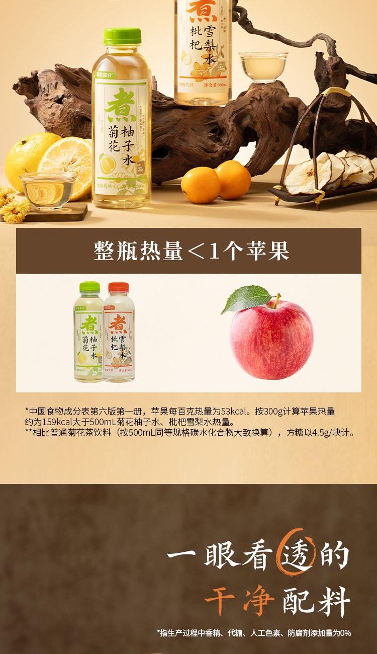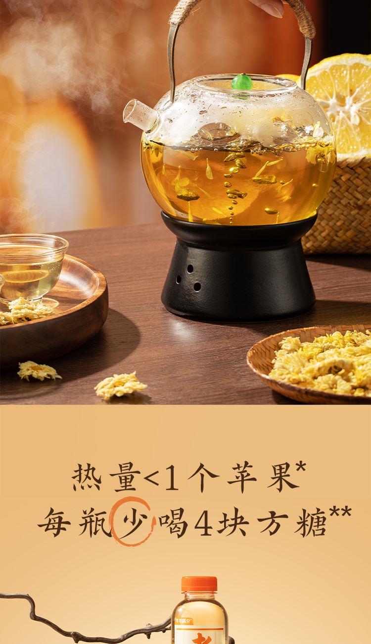 臻选道地杭白菊 自带花蜜清香 特产香柚(YUZU) 连皮带肉,NFC整果榨汁 广式清火小凉茶 不急不躁,慢享舒畅 水、黄冰糖、杭白菊>6g/L、香柚汁>3g/L