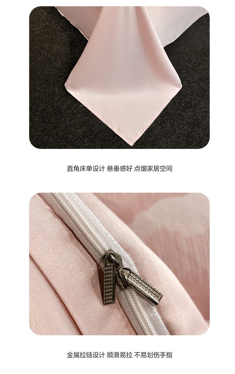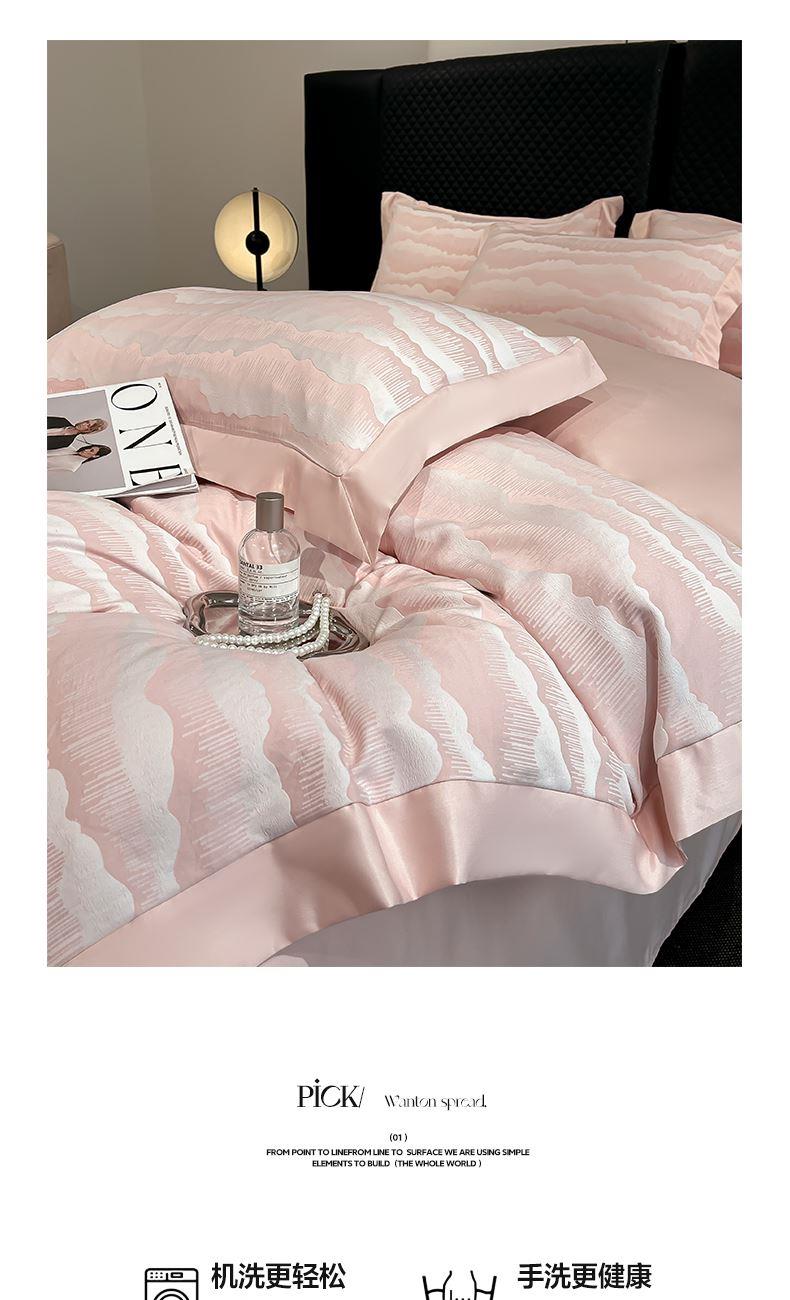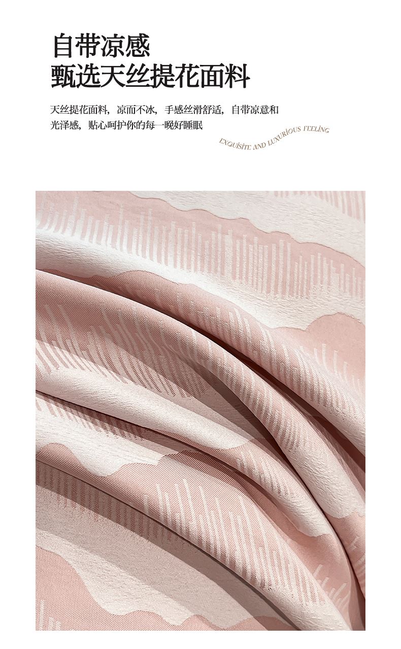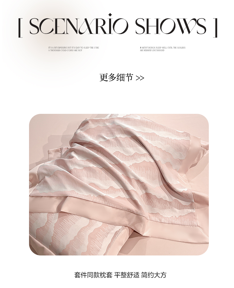 规格:被套200*230cm*1床单245*245cm*1枕套48x74cm*2 面料:聚酯纤维(水洗天丝) 花色:万重山-烟波蓝、万重山-胭脂粉、万重山-薄雾灰、万重山-月光白 水洗天丝数码印花 AB版四件套系列 灵感并发 沉浸生活意趣 遇见轻奢生活之美 沉浸在清凉 之中 与优雅融为一体 有颜 好看 好睡 精选水洗冰丝面料 吸湿透气 光泽感强 质地柔软 手感细腻 如丝崔顺软糯 水洗天丝面料 快速吸收汗液 和水分 导湿快新能好 触感清爽 不粘腻 贴肤沁凉不冰 空调房也能使用 比普通平滑面料更透气 既平衡面料 质感 又拥有较好的透气性环保喷印 色牢度高 颜色靓丽 可水洗机洗 不易褪色 呵护品质生活