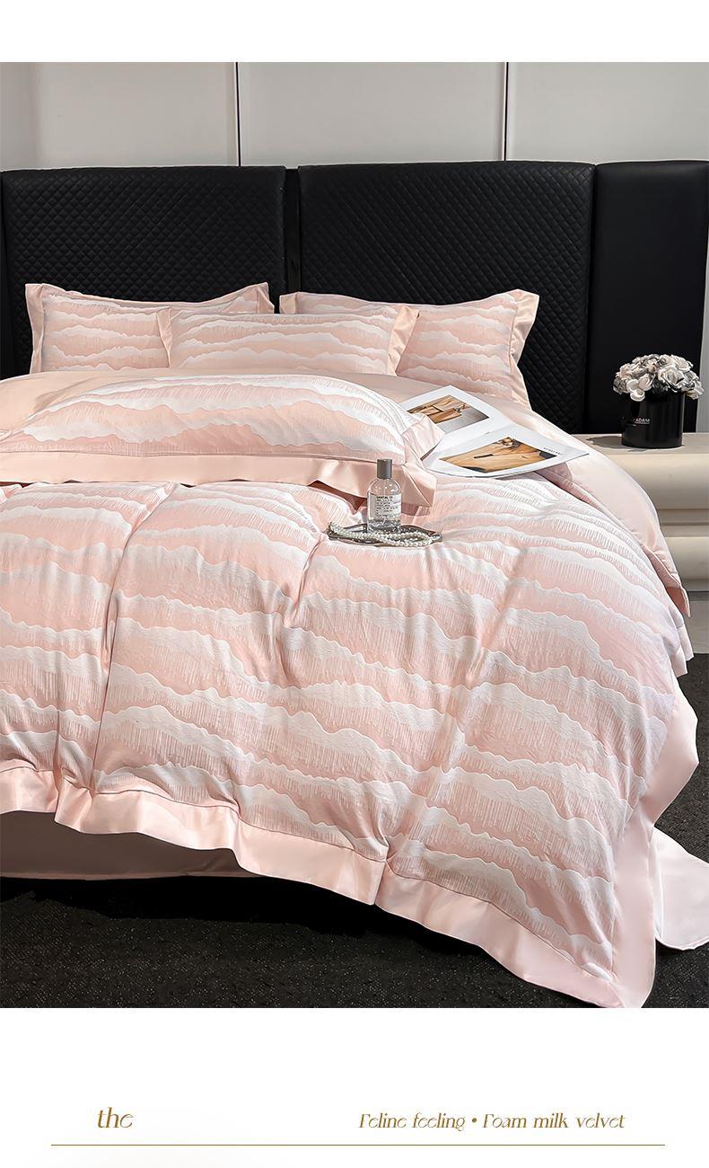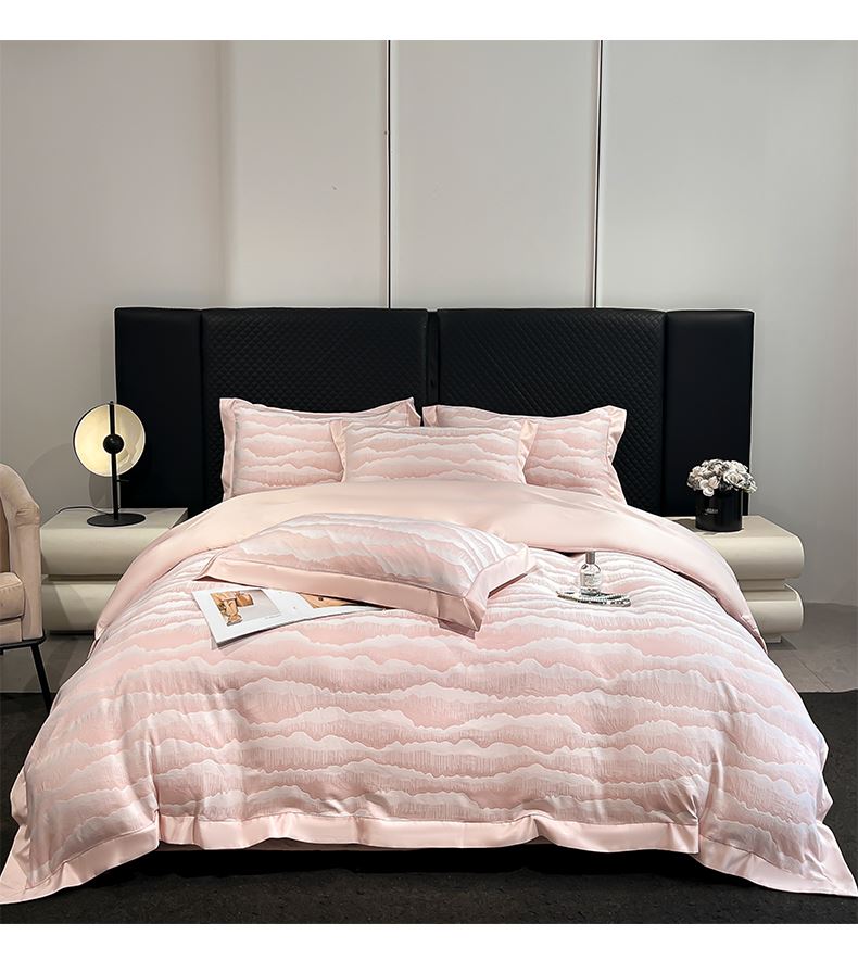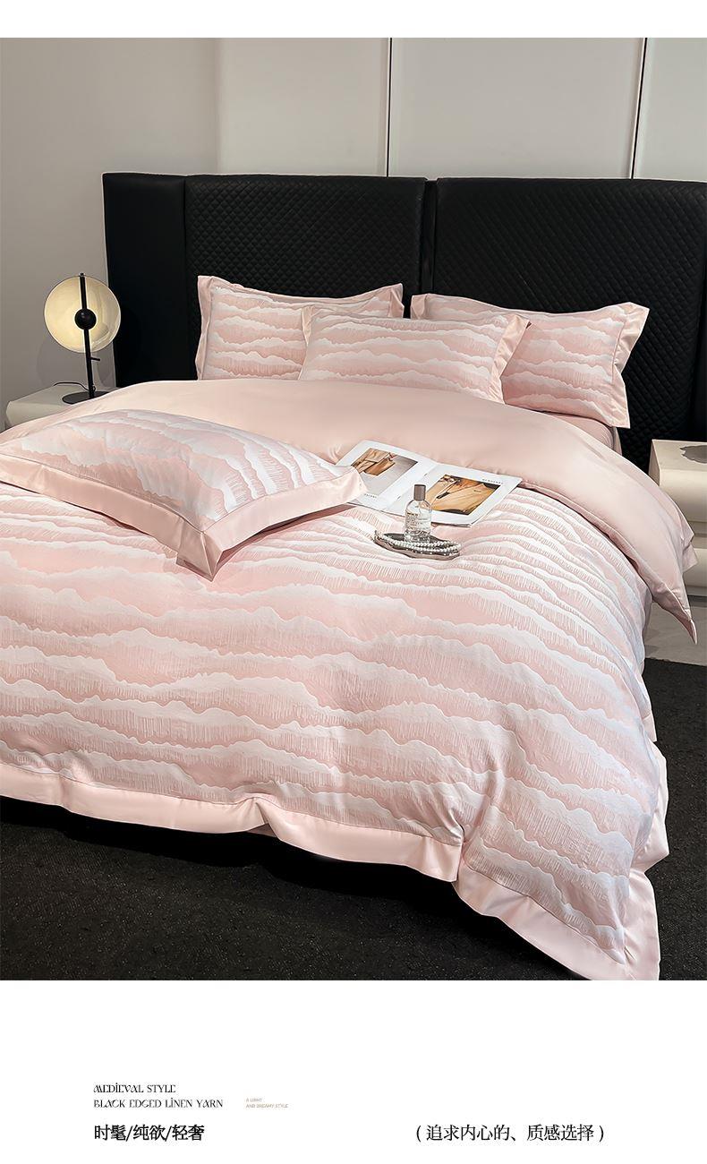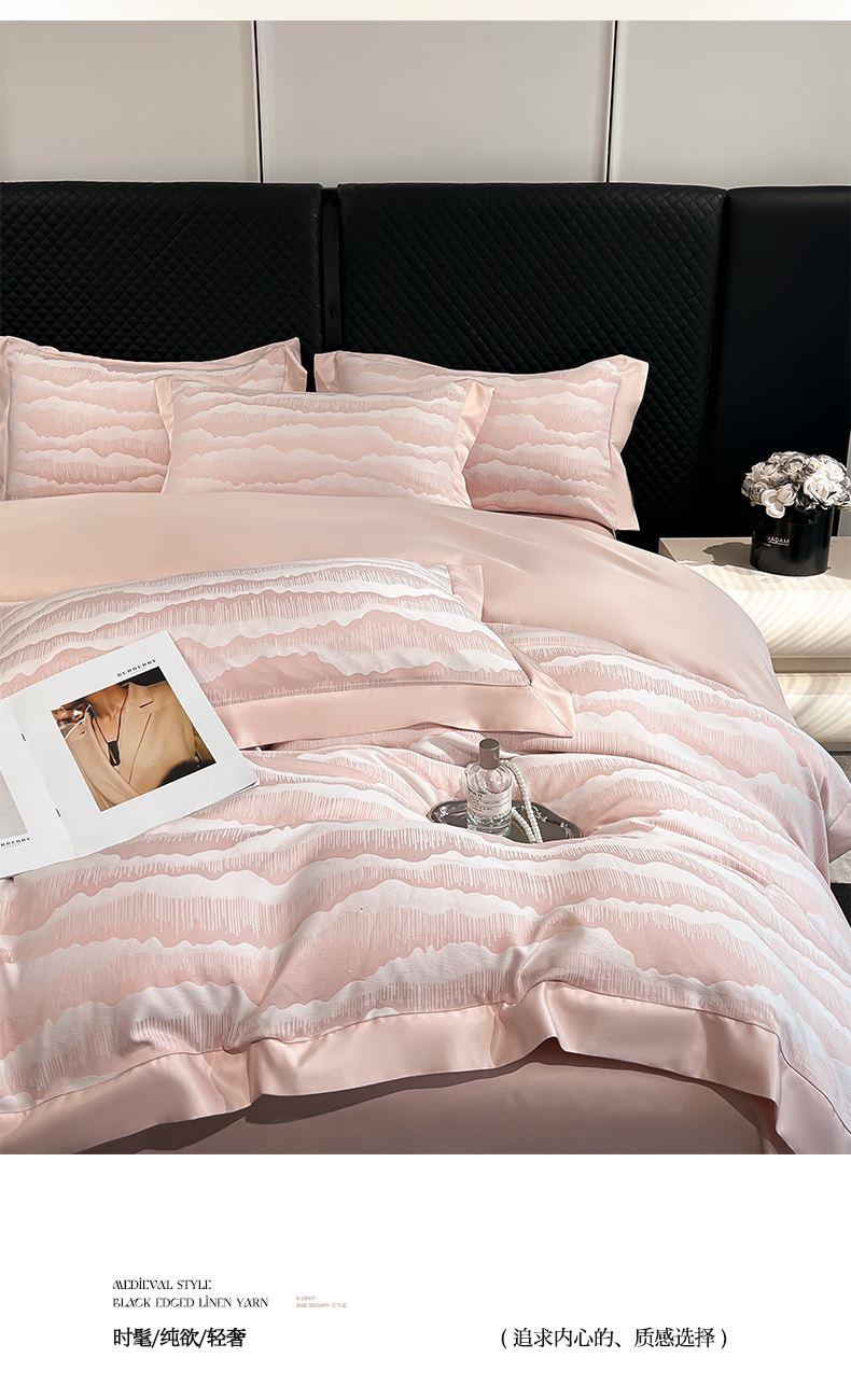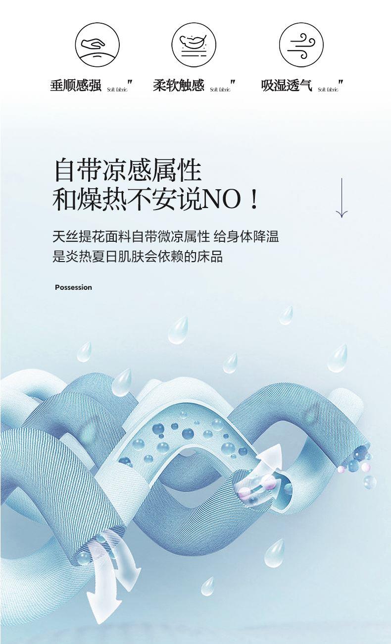 规格:被套200*230cm*1床单245*245cm*1枕套48x74cm*2 面料:聚酯纤维(水洗天丝) 花色:万重山-烟波蓝、万重山-胭脂粉、万重山-薄雾灰、万重山-月光白 水洗天丝数码印花 AB版四件套系列 灵感并发 沉浸生活意趣 遇见轻奢生活之美 沉浸在清凉 之中 与优雅融为一体 有颜 好看 好睡 精选水洗冰丝面料 吸湿透气 光泽感强 质地柔软 手感细腻 如丝崔顺软糯 水洗天丝面料 快速吸收汗液 和水分 导湿快新能好 触感清爽 不粘腻 贴肤沁凉不冰 空调房也能使用 比普通平滑面料更透气 既平衡面料 质感 又拥有较好的透气性环保喷印 色牢度高 颜色靓丽 可水洗机洗 不易褪色 呵护品质生活