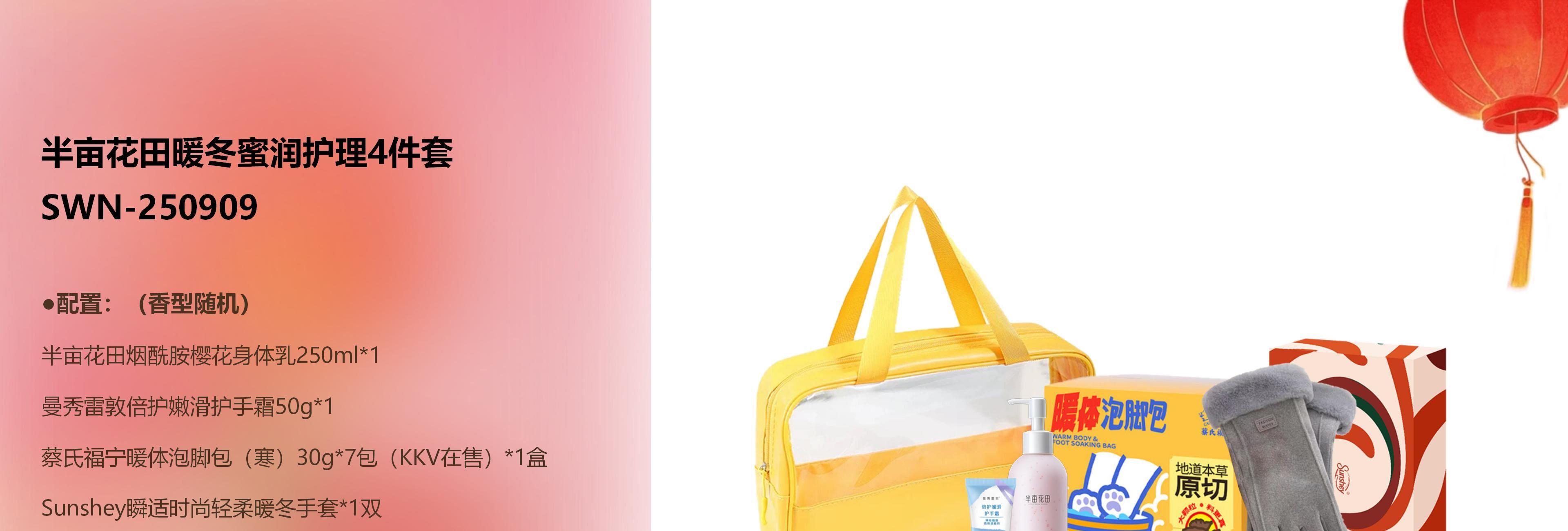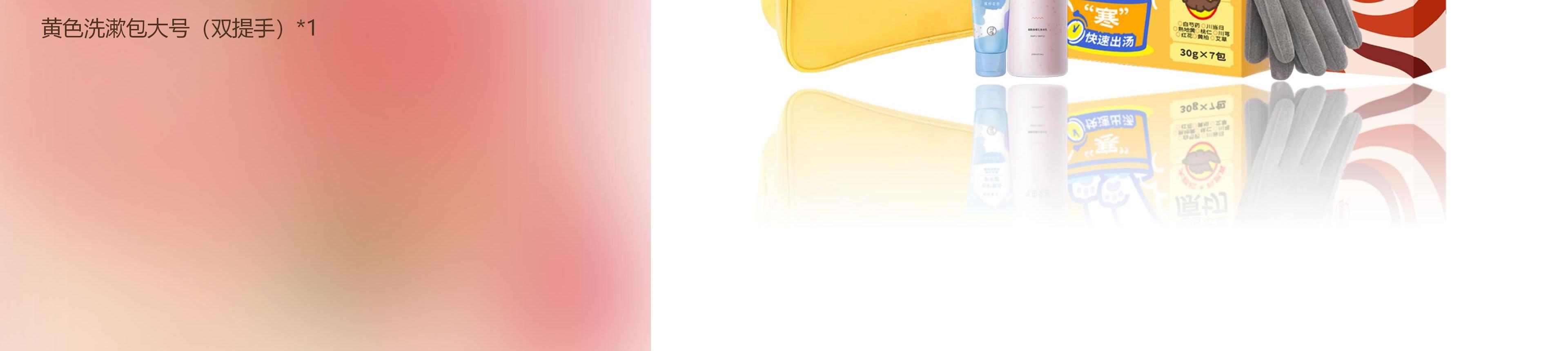 配置:(香型随机) 半亩花田烟酰胺樱花身体乳250ml*1 曼秀雷敦倍护嫩滑护手霜50g*1 蔡氏福宁暖体泡脚包(寒)30g*7包(KKV在售)*1盒 Sunshey瞬适时尚轻柔暖冬手套*1双 黄色洗漱包大号(双提手)*1
