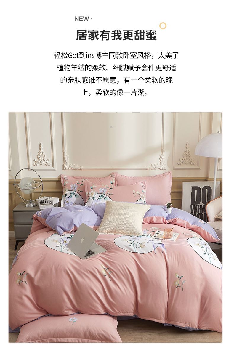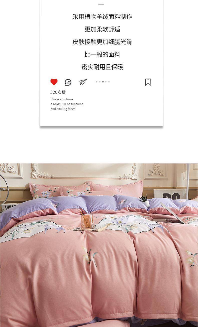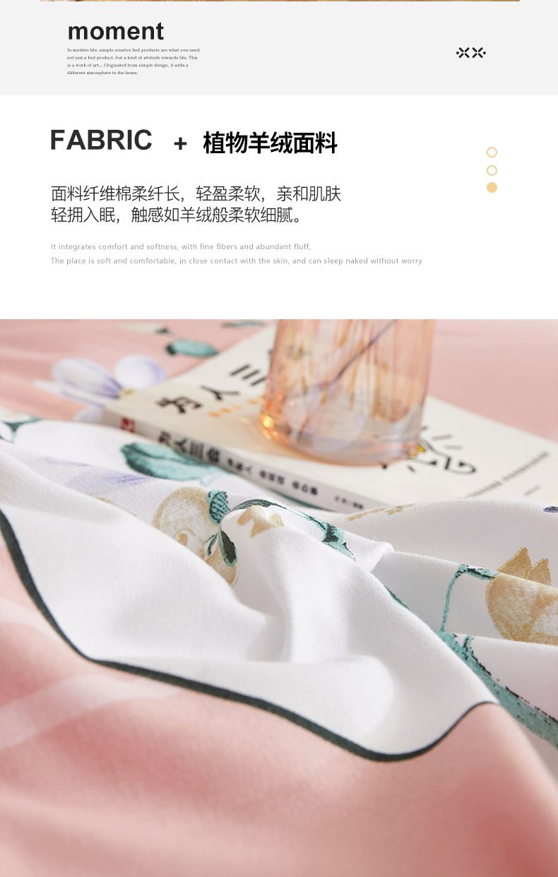 规格:被套200*230cm 床单230*245cm 枕套48*74cm(1.5/1.8米床) 面料:140克高克重植物羊绒面料 花色:轻享时光、甜心熊、小奢猫、炫彩黄、 迎春满枝兰、迎春满枝粉、 芝华士、沐雅、花下麋鹿、约里克、致简致雅 加厚磨毛植物羊绒面料,表层还有一种短绒毛的感觉,有效的降低磨毛面料的导热性,同时还增加布料的保暖性和柔软性,磨毛面料色泽醒目,手感柔和,外观赏心悦目,质感丰厚,悬垂感强、易于护理、绒面丰盈。享舒适、源自于阳光暖绒、被窝里的小太阳。