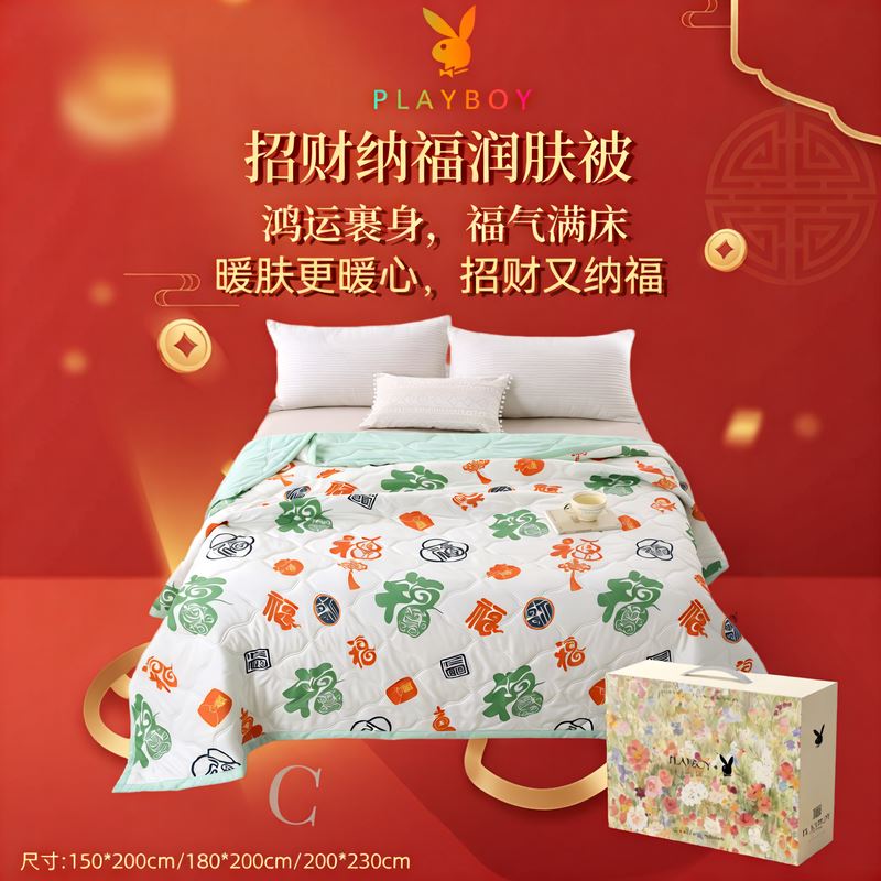 1:招财纳福润肤被 鸿运裹身 福气满床 暖肤更暖心 招财又纳福 烫金LOGO,质感尽显格调 尺寸:180*200cm*1 包装:彩盒