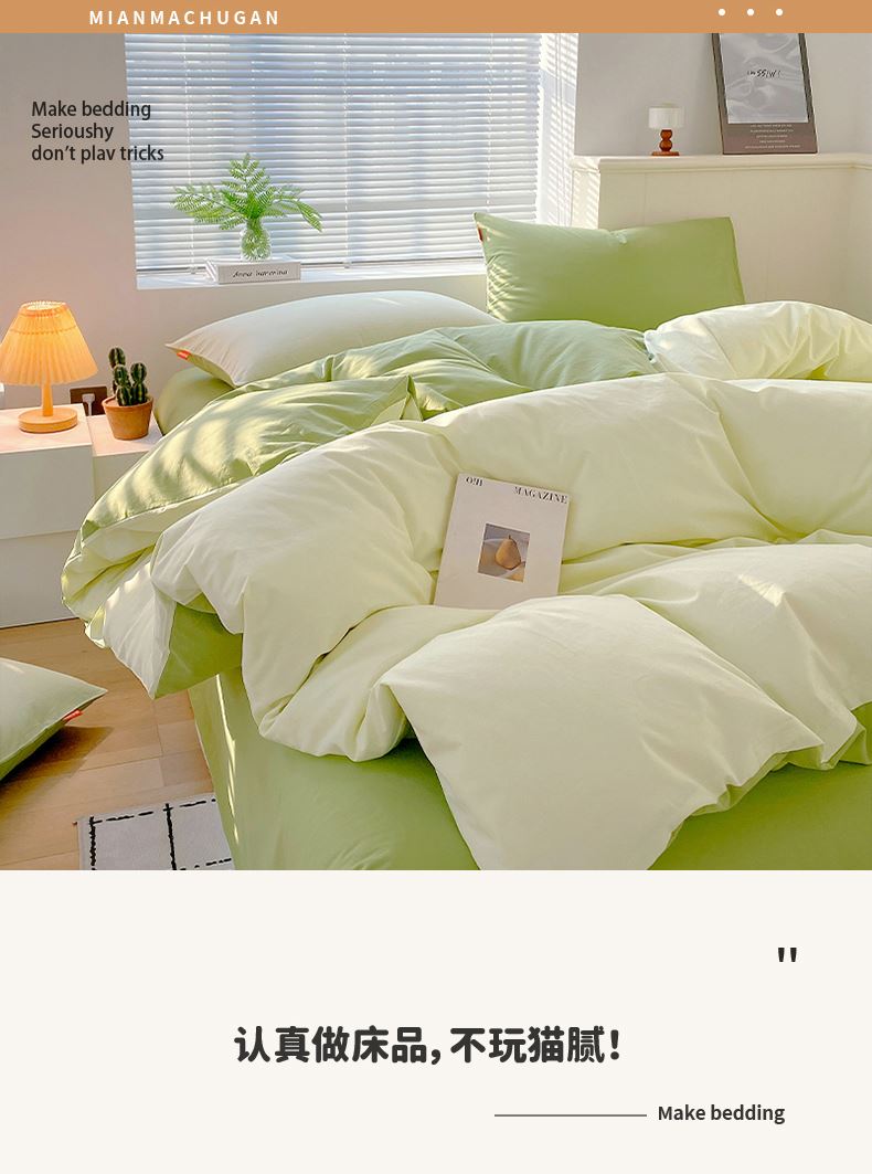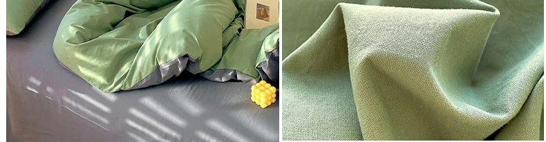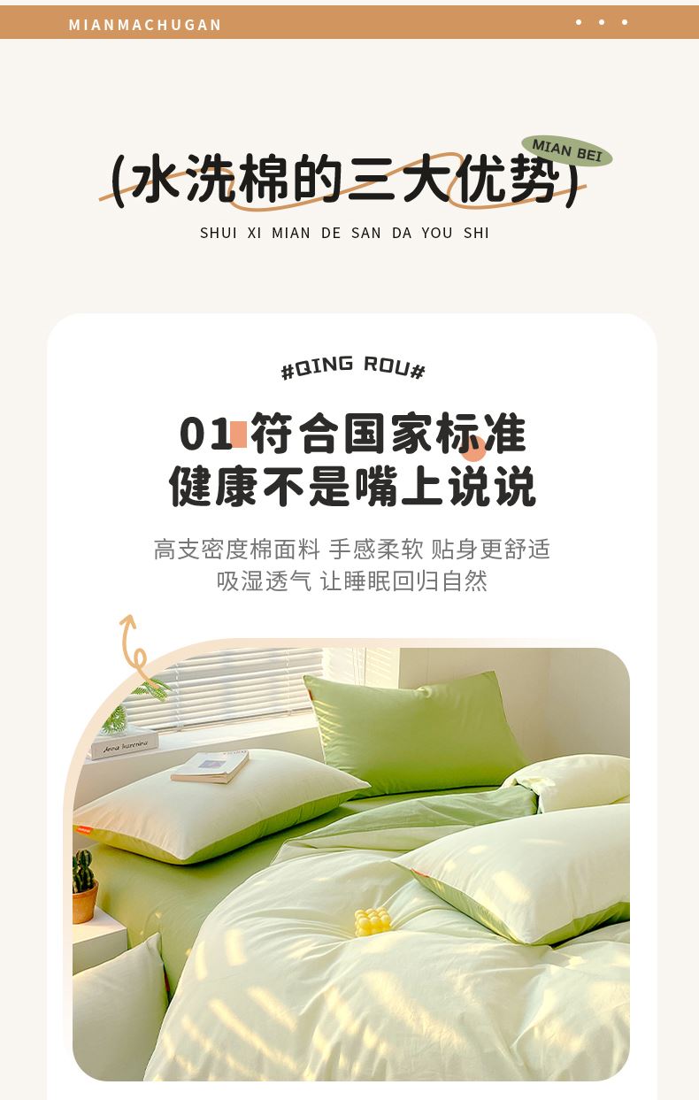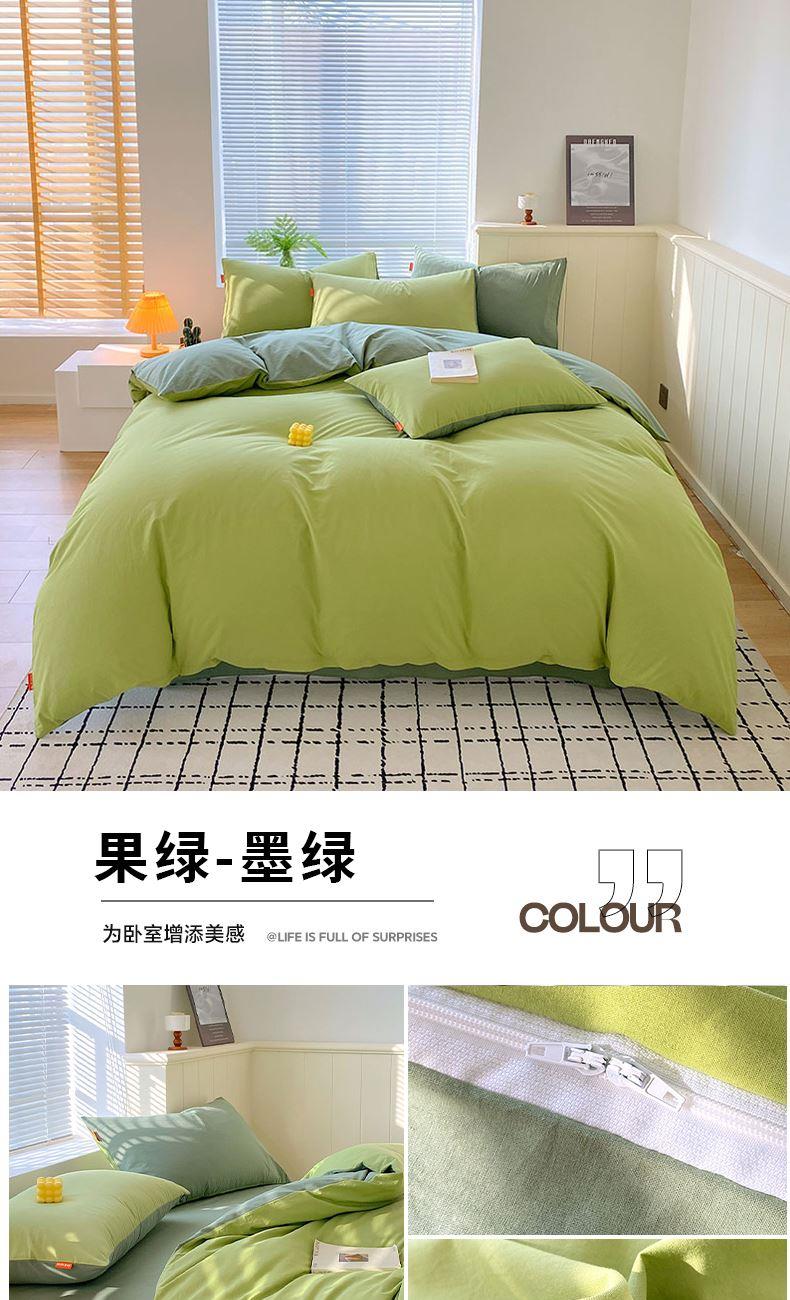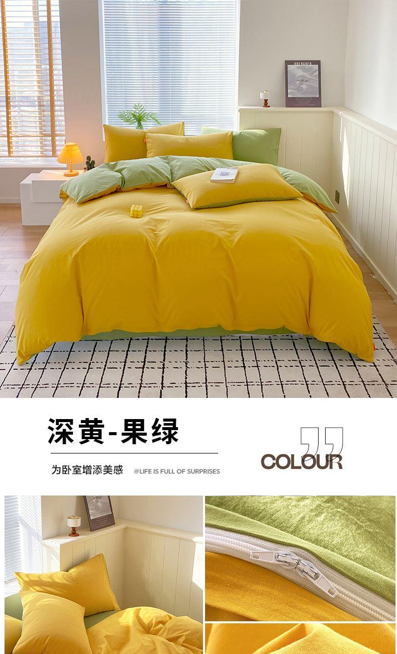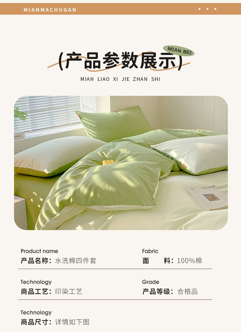 规格:被套200*230cm 床单240*245cm 枕套48x74cm 面料:全棉。棉纱:32S*32S.织数:84*72. 花色:果绿-墨绿,焦糖-深黄,墨绿-深灰,浅黄-果绿,浅灰-卡其,浅玉-卡其,浅玉-浅黄,深黄-果绿,深黄-浅黄,深灰-浅灰,水蓝-浅黄,水蓝-天蓝 喷气平纹。印染:古老印染工艺,环保,健康。水洗:经过水洗工艺处理,更环保,贴肤,全棉缩水也解决了