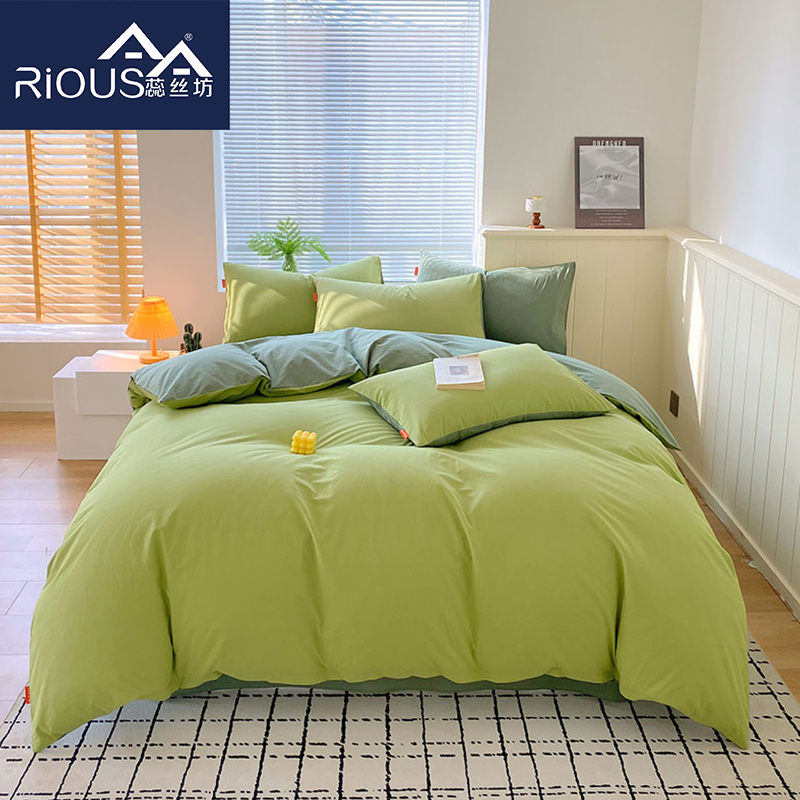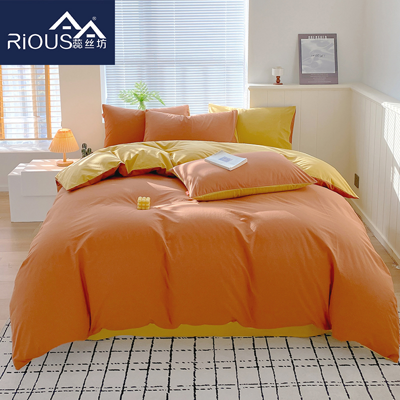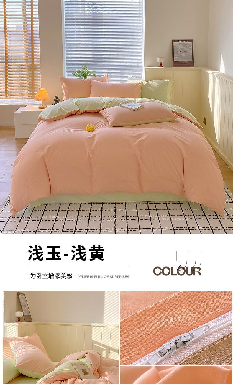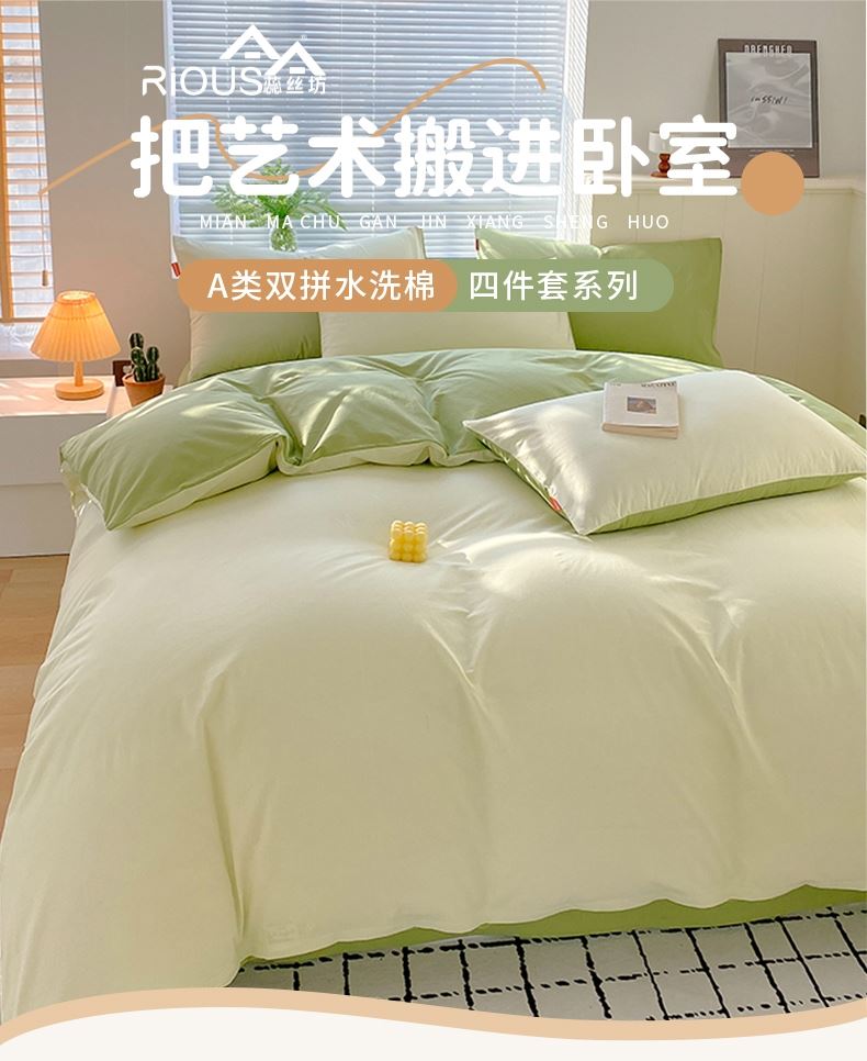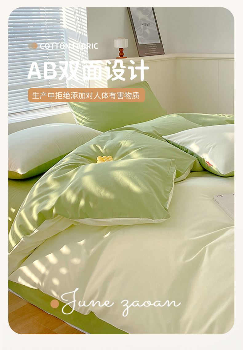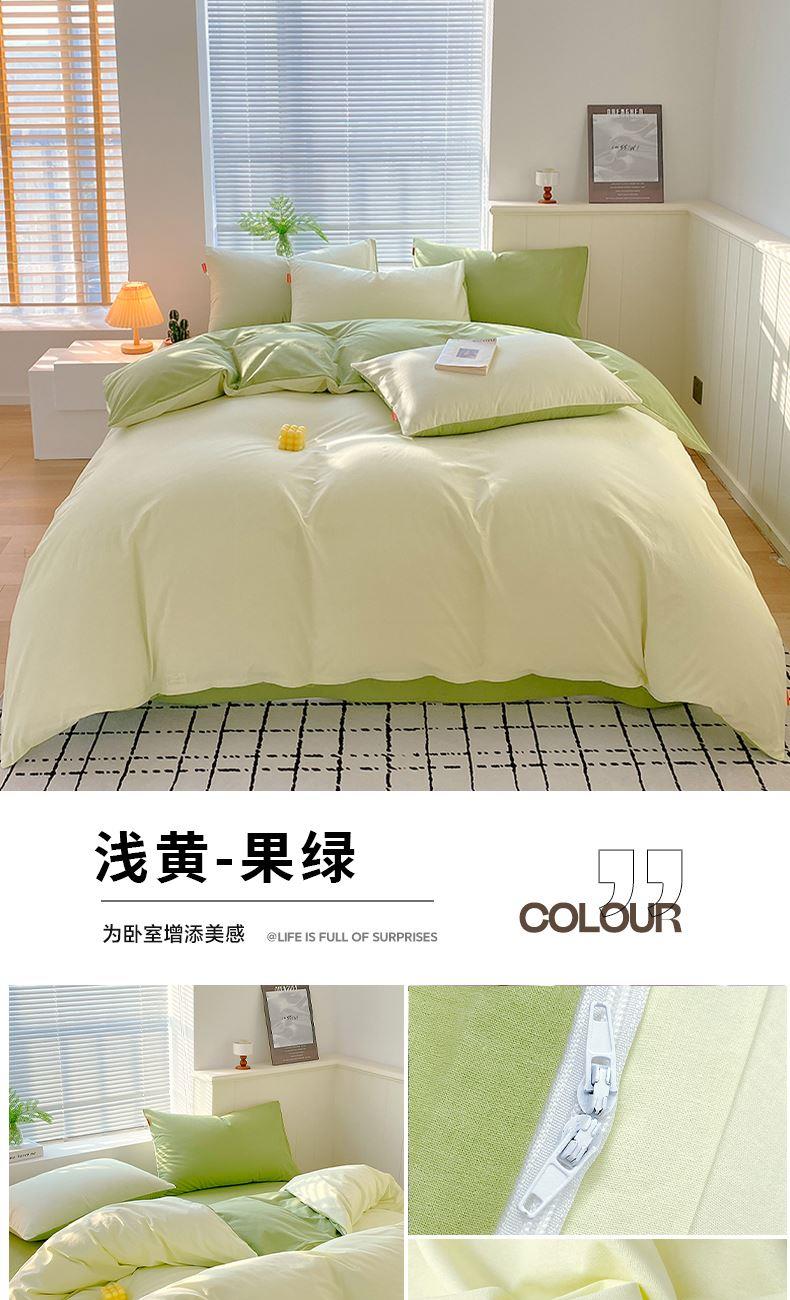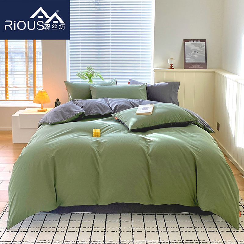规格:被套200*230cm 床单240*245cm 枕套48x74cm 面料:全棉。棉纱:32S*32S.织数:84*72. 花色:果绿-墨绿,焦糖-深黄,墨绿-深灰,浅黄-果绿,浅灰-卡其,浅玉-卡其,浅玉-浅黄,深黄-果绿,深黄-浅黄,深灰-浅灰,水蓝-浅黄,水蓝-天蓝 喷气平纹。印染:古老印染工艺,环保,健康。水洗:经过水洗工艺处理,更环保,贴肤,全棉缩水也解决了