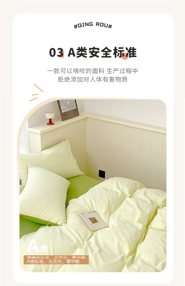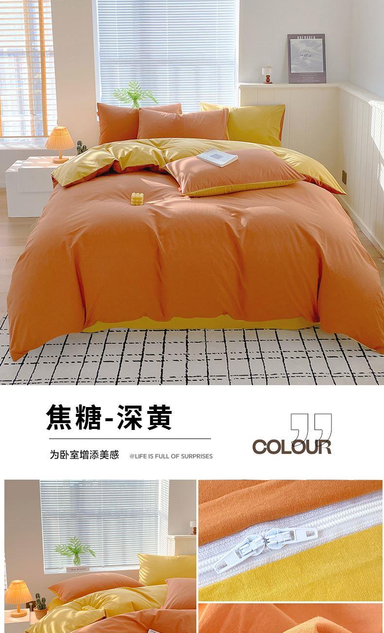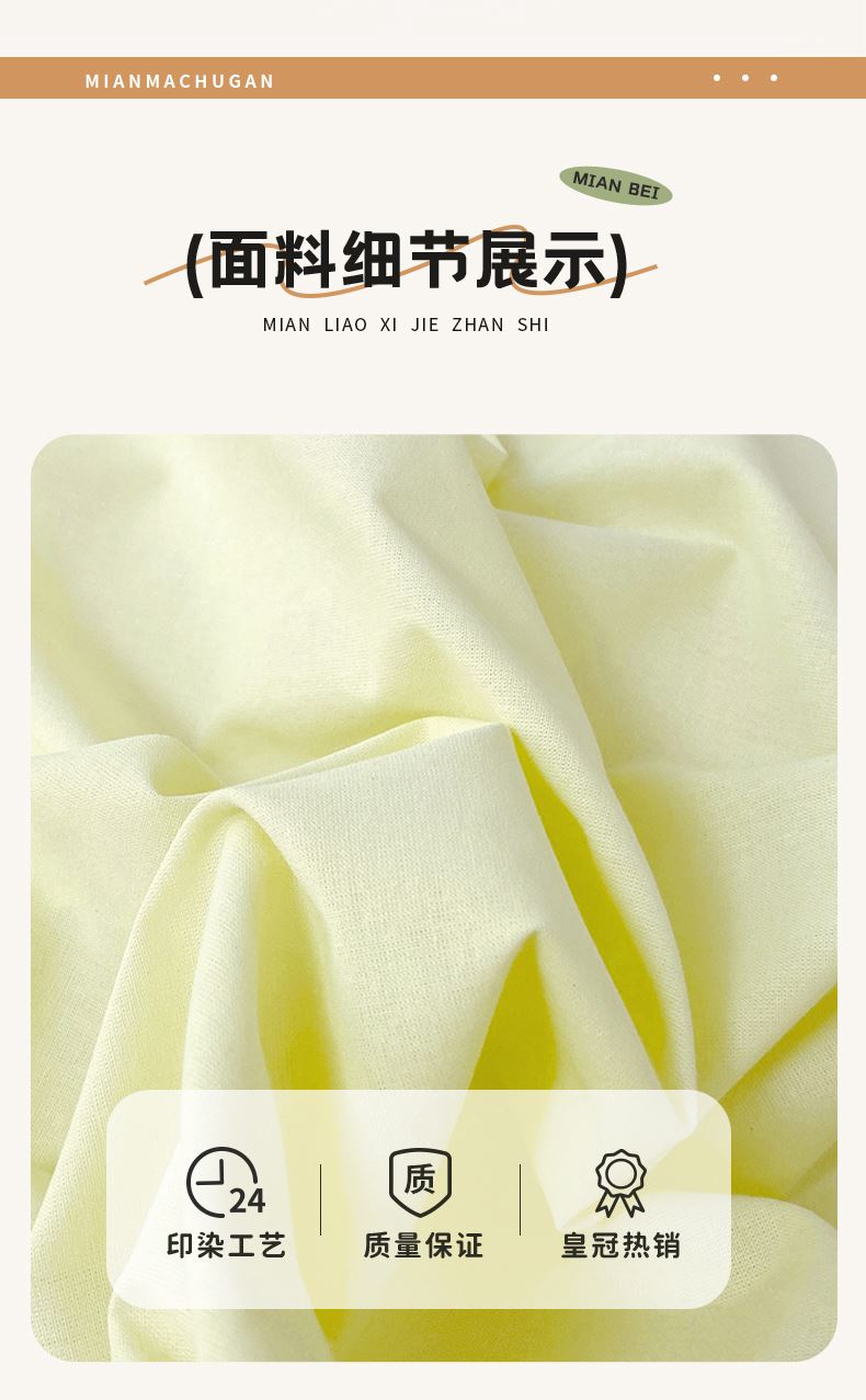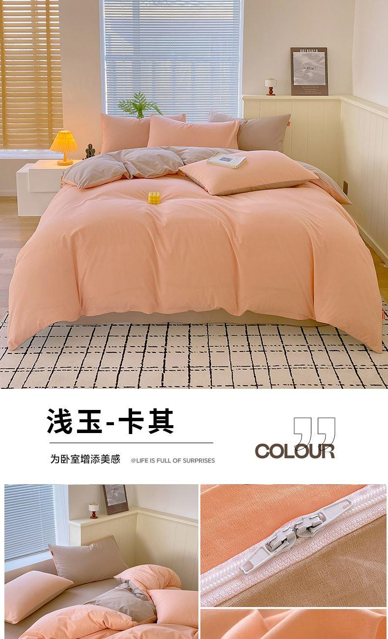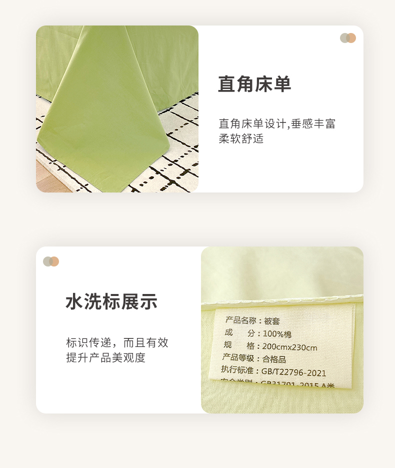 规格:被套200*230cm 床单240*245cm 枕套48x74cm 面料:全棉。棉纱:32S*32S.织数:84*72. 花色:果绿-墨绿,焦糖-深黄,墨绿-深灰,浅黄-果绿,浅灰-卡其,浅玉-卡其,浅玉-浅黄,深黄-果绿,深黄-浅黄,深灰-浅灰,水蓝-浅黄,水蓝-天蓝 喷气平纹。印染:古老印染工艺,环保,健康。水洗:经过水洗工艺处理,更环保,贴肤,全棉缩水也解决了