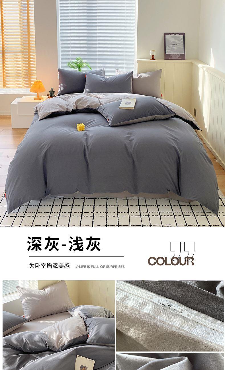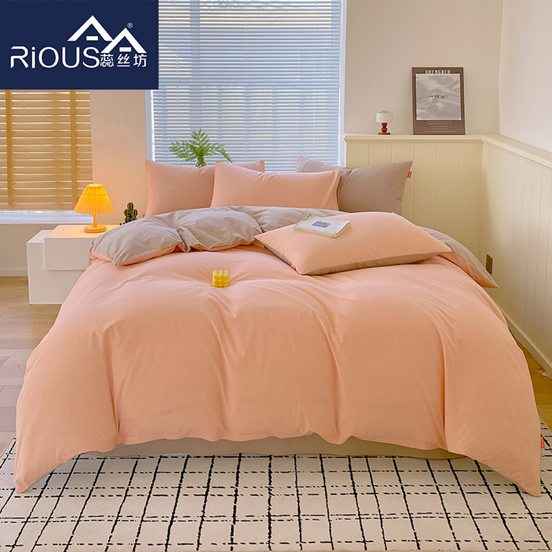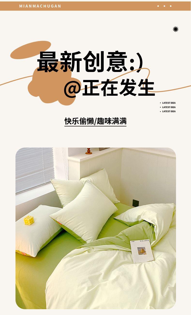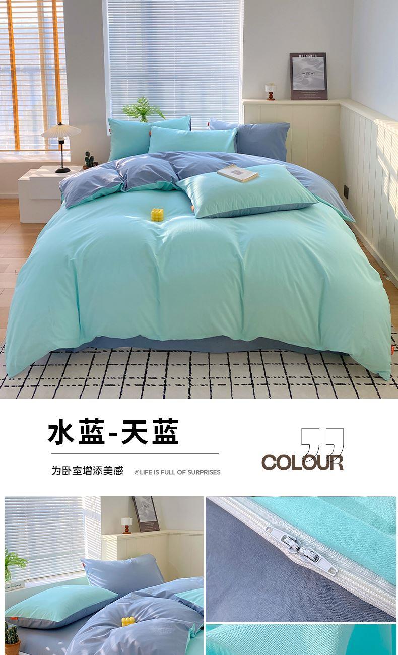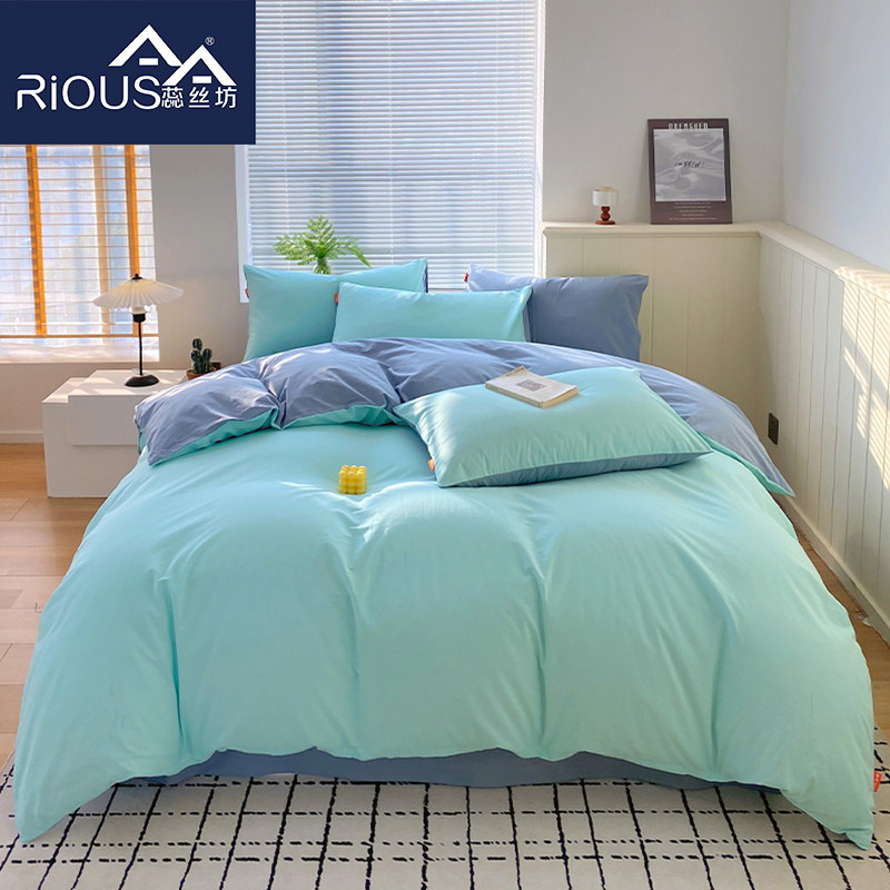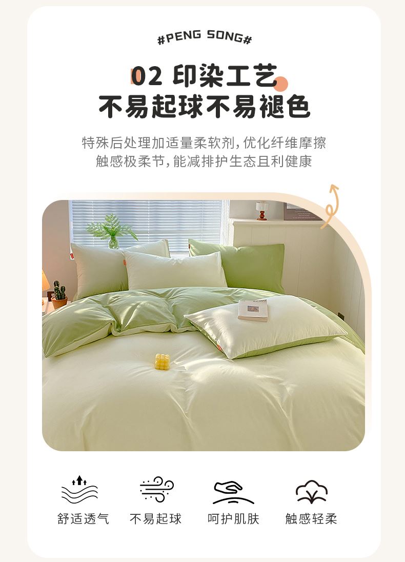 规格:被套200*230cm 床单240*245cm 枕套48x74cm 面料:全棉。棉纱:32S*32S.织数:84*72. 花色:果绿-墨绿,焦糖-深黄,墨绿-深灰,浅黄-果绿,浅灰-卡其,浅玉-卡其,浅玉-浅黄,深黄-果绿,深黄-浅黄,深灰-浅灰,水蓝-浅黄,水蓝-天蓝 喷气平纹。印染:古老印染工艺,环保,健康。水洗:经过水洗工艺处理,更环保,贴肤,全棉缩水也解决了