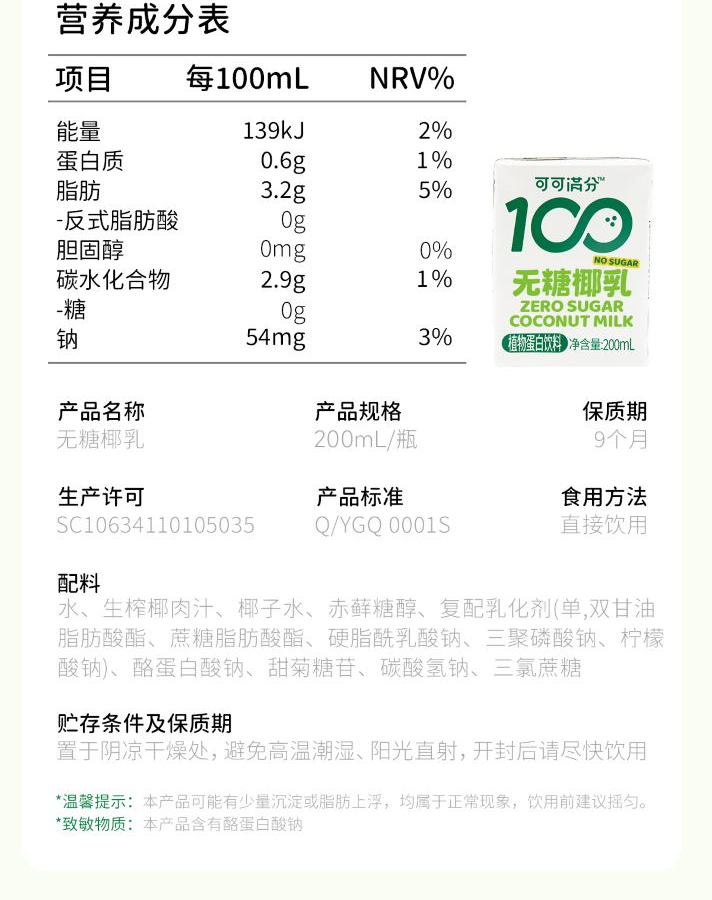 可可满分无糖椰乳200ml*8瓶