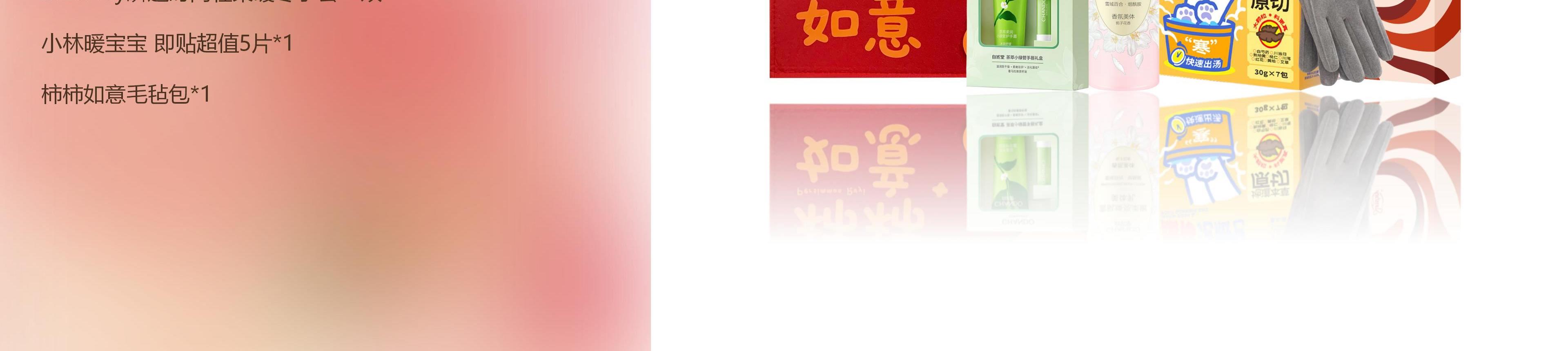 配置:(香型随机) 自然堂雪肌焕亮柔嫩美体乳600g*1 自然堂茶萃小绿管手唇礼盒*1 蔡氏福宁暖体泡脚包(寒)30g*7包(KKV在售)*1盒 Sunshey瞬适时尚轻柔暖冬手套*1双 小林暖宝宝 即贴超值5片*1 柿柿如意毛毡包*1