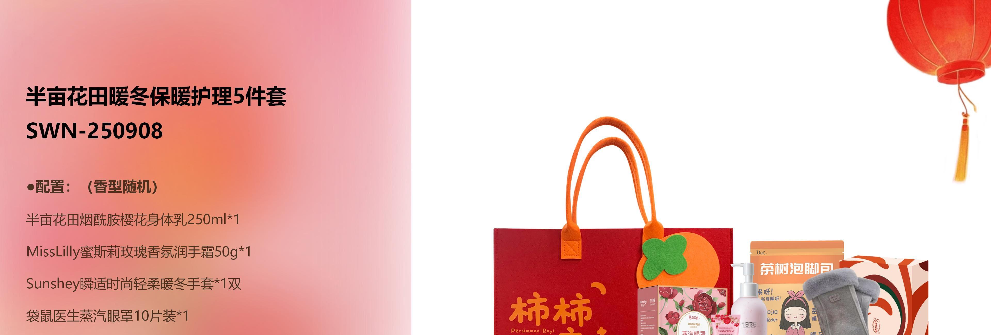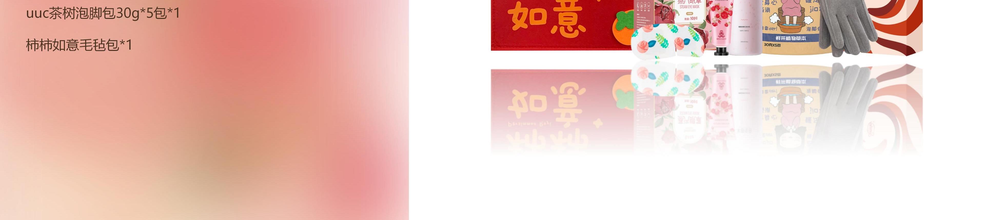 配置:(香型随机) 半亩花田烟酰胺樱花身体乳250ml*1 MissLilly蜜斯莉玫瑰香氛润手霜50g*1 Sunshey瞬适时尚轻柔暖冬手套*1双 袋鼠医生蒸汽眼罩10片装*1 uuc茶树泡脚包30g*5包*1 柿柿如意毛毡包*1