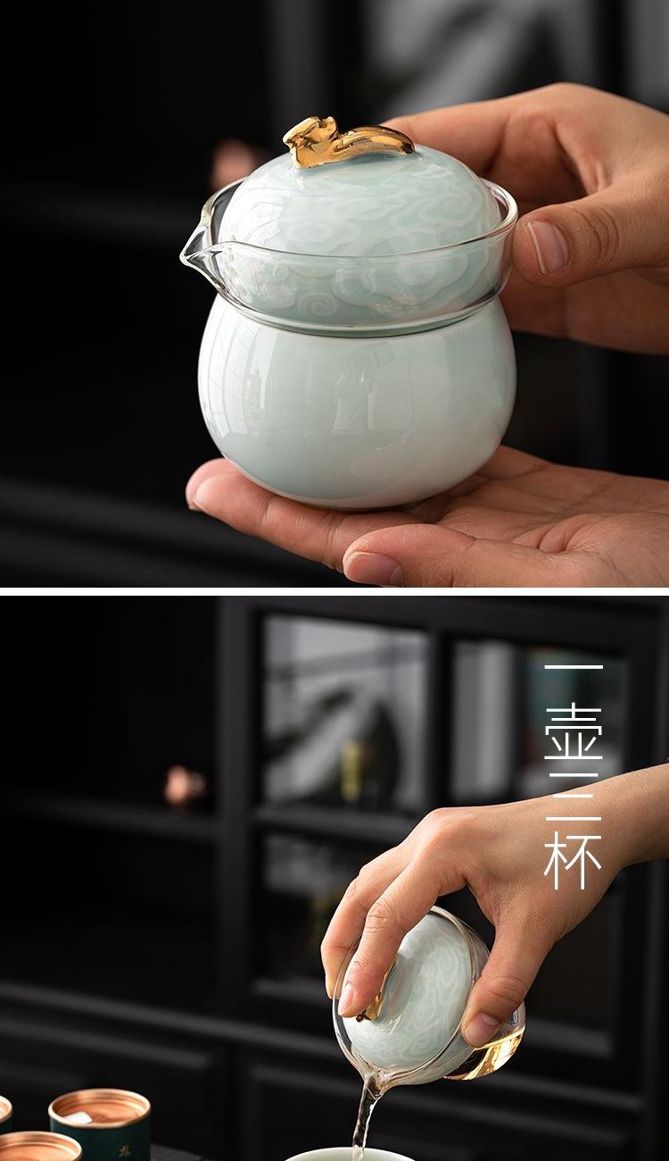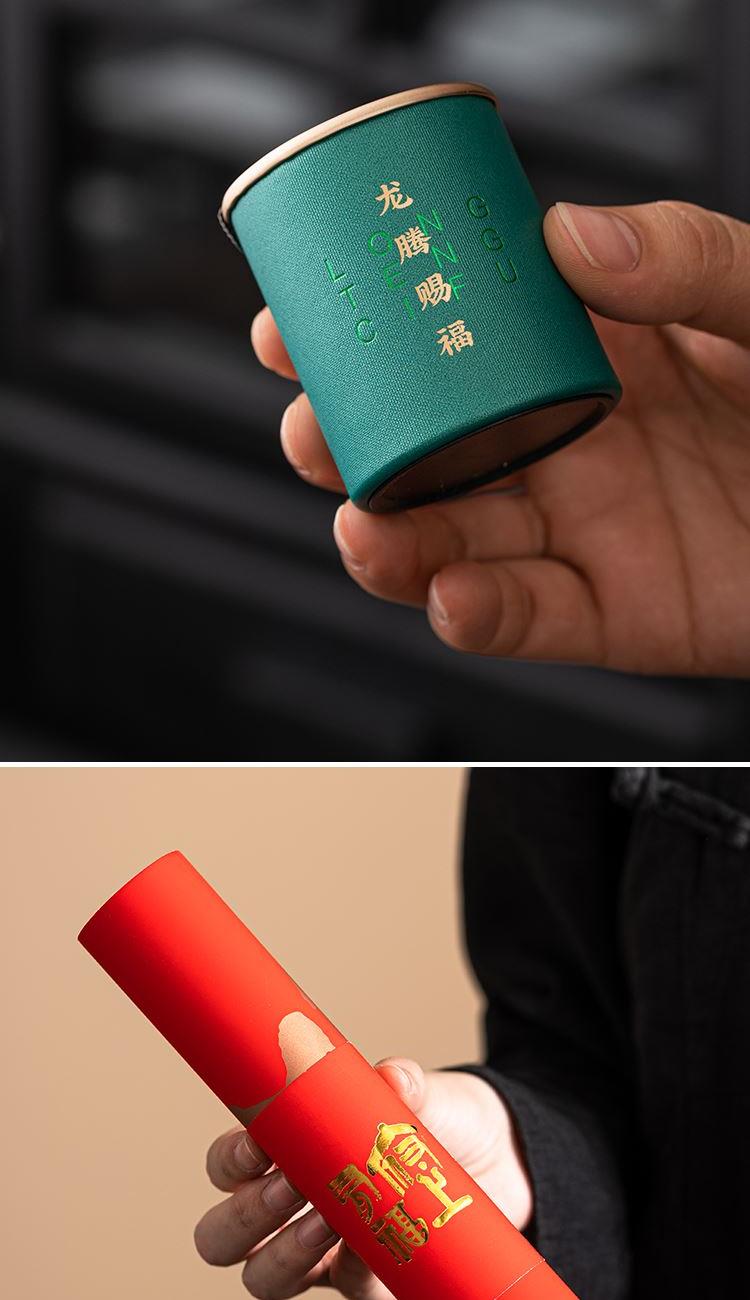 设计理念:《龙腾赐福》以青釉葫芦瓶为主要设计灵感,整体造型上圆润 饱满。壶盖钮提取龙纹玉带钩,仿佛龙吟九霄;品杯,以“倒葫芦”状,有“福到”之意。 以陶瓷器皿为载体,以“葫”谐“福”,寄意福到万家,人人安康幸福。 配置:茶壶*1、青瓷主人杯*1、青瓷葫芦客杯*2、对联*1、红包*6、 正山小种*8罐、设计理念卡片*1、浮雕烫金礼盒、礼袋