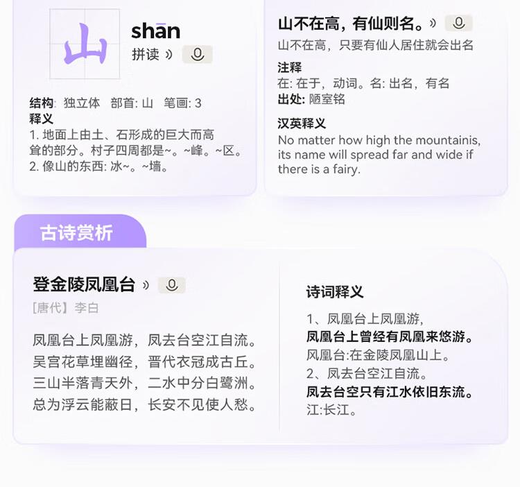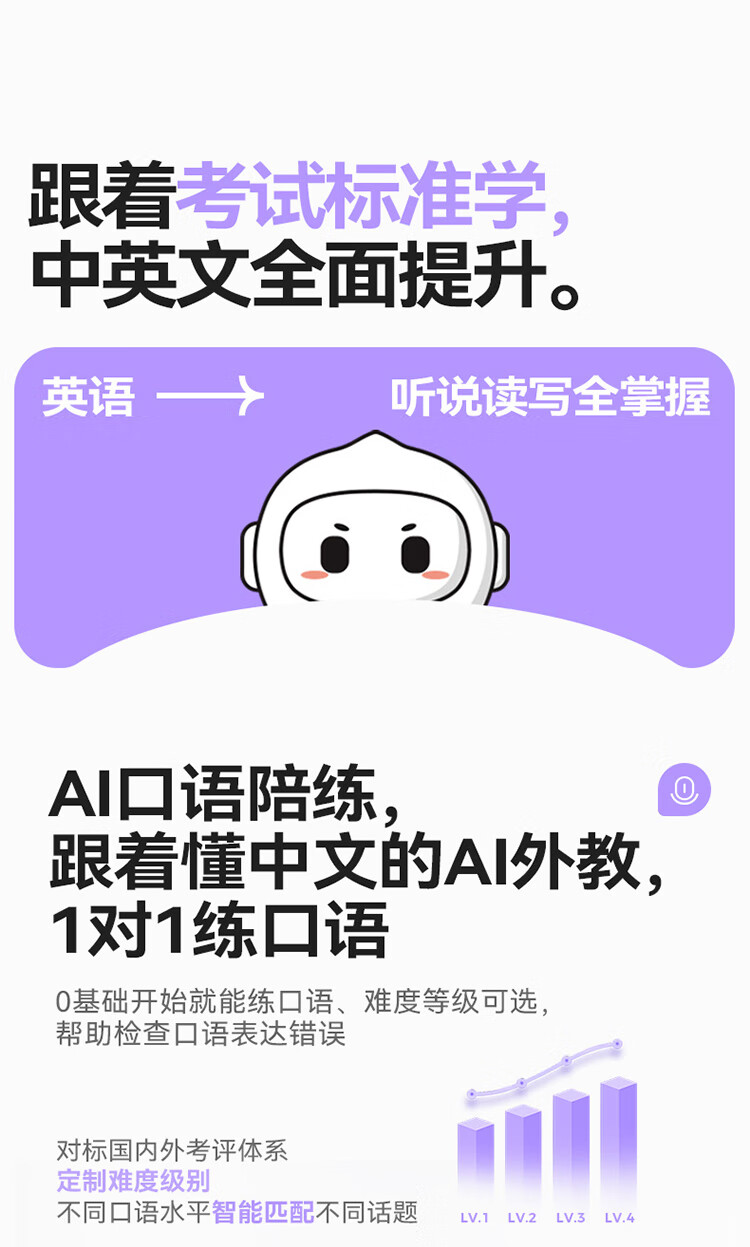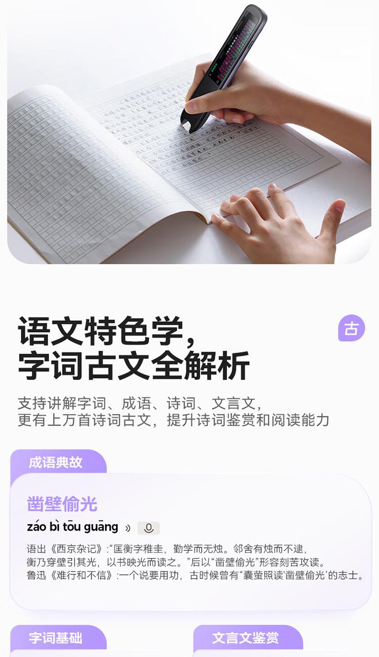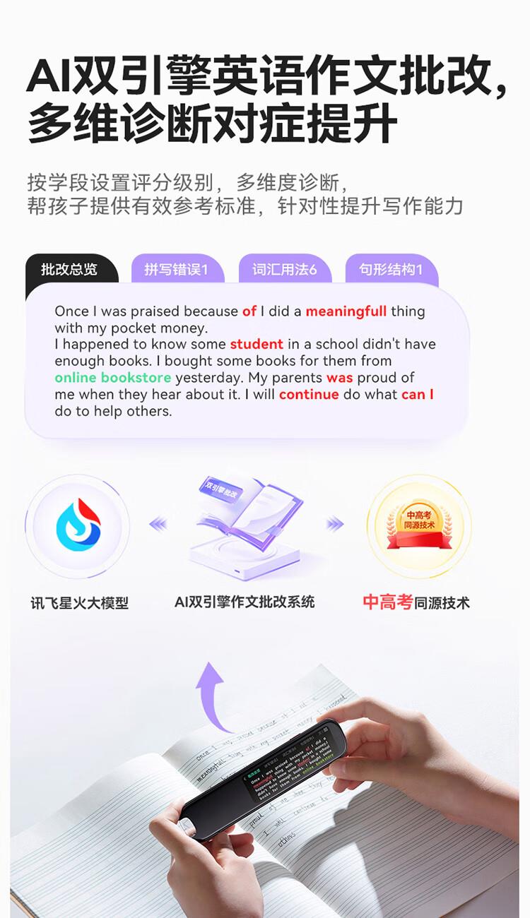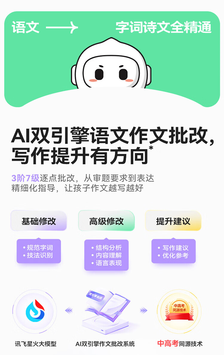 重写作 中文+英文AI作文批改,像专业老师一样辅导,针对提升写作能力 重阅读 内置AI语法精讲功能,帮孩子攻克长难句,化解阅读障碍 重口语 跟着考试标准练口语讯飞星火大模型口语陪练真实场景中 1对1练口语 重词汇 内置近100本权威正版词典 智能匹配孩子需要的内容更覆盖经济、建筑、法学等20多个学科 重文化 内置《语海》、《唐诗鉴赏辞典》等多本深度赏析中国文化词典更有上万首诗词古文