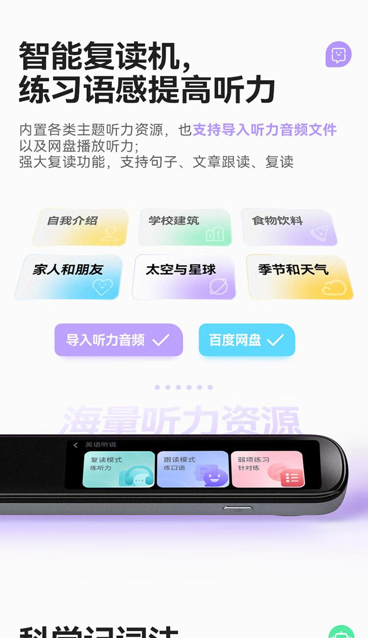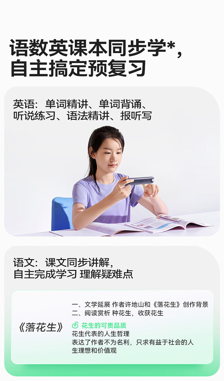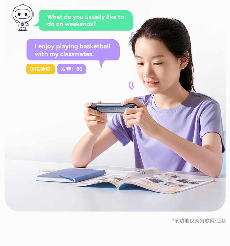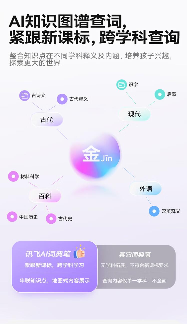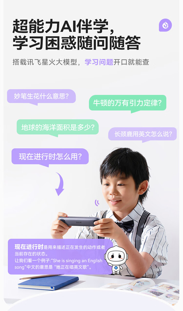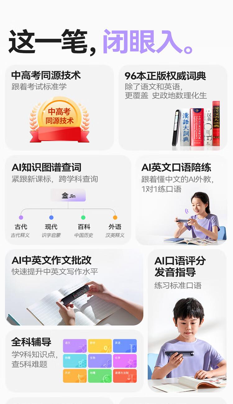 重写作 中文+英文AI作文批改,像专业老师一样辅导,针对提升写作能力 重阅读 内置AI语法精讲功能,帮孩子攻克长难句,化解阅读障碍 重口语 跟着考试标准练口语讯飞星火大模型口语陪练真实场景中 1对1练口语 重词汇 内置近100本权威正版词典 智能匹配孩子需要的内容更覆盖经济、建筑、法学等20多个学科 重文化 内置《语海》、《唐诗鉴赏辞典》等多本深度赏析中国文化词典更有上万首诗词古文