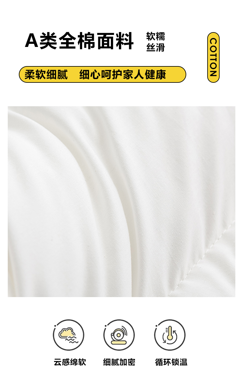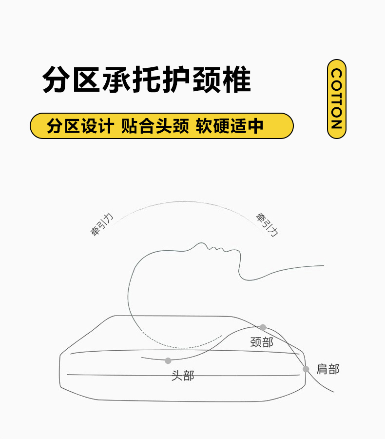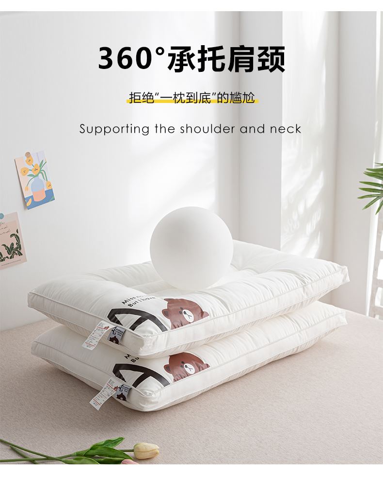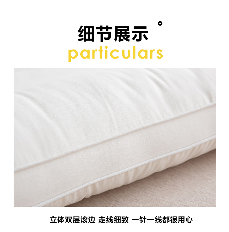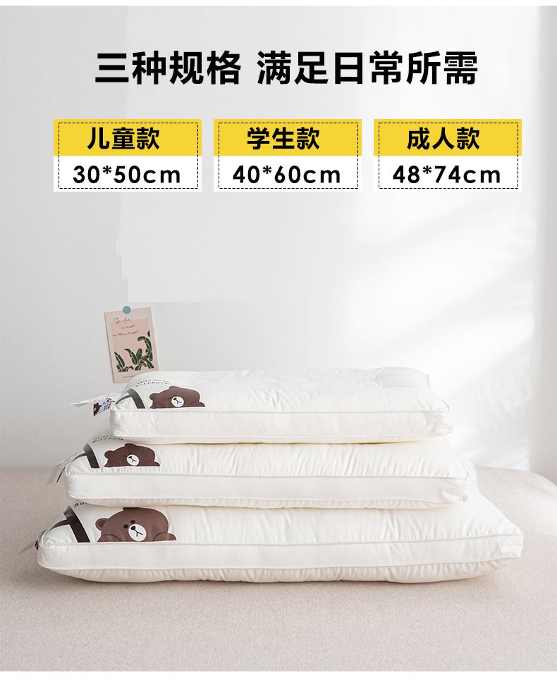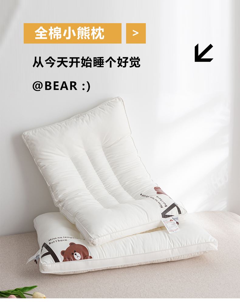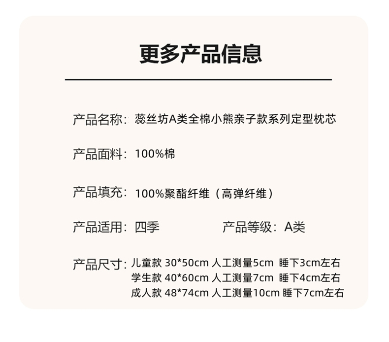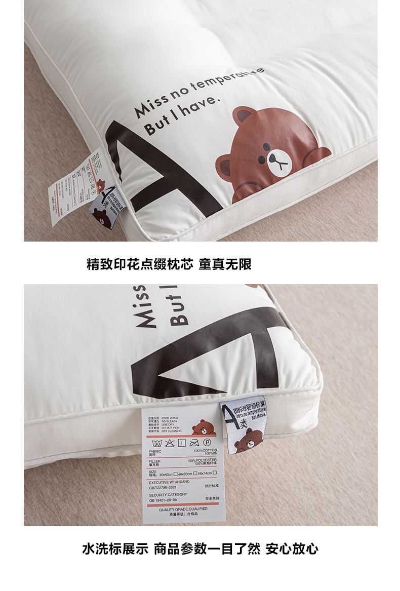 规格:48*74cm成人枕 约10cm(睡下约7cm) 面料:棉 填充:高弹纤维(聚酯纤维) A类母婴级别全棉面料,软糯丝滑,柔软细腻,细心呵护全家健康;高弹羽丝绒,舒适承托,不易塌陷,360°承托肩颈,舒适包裹好睡眠;软硬适中,分区承托护颈椎;立体双边滚边,走线细致,精致印花点缀枕芯,增加童趣。