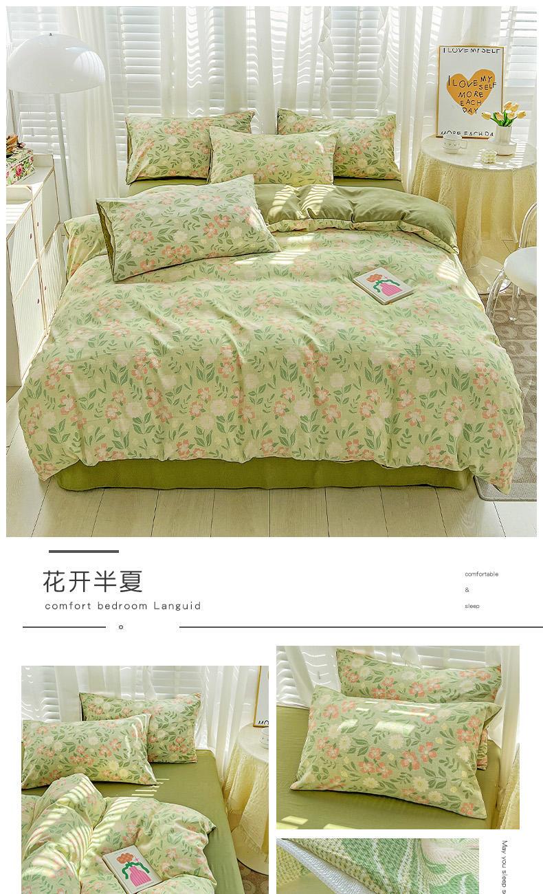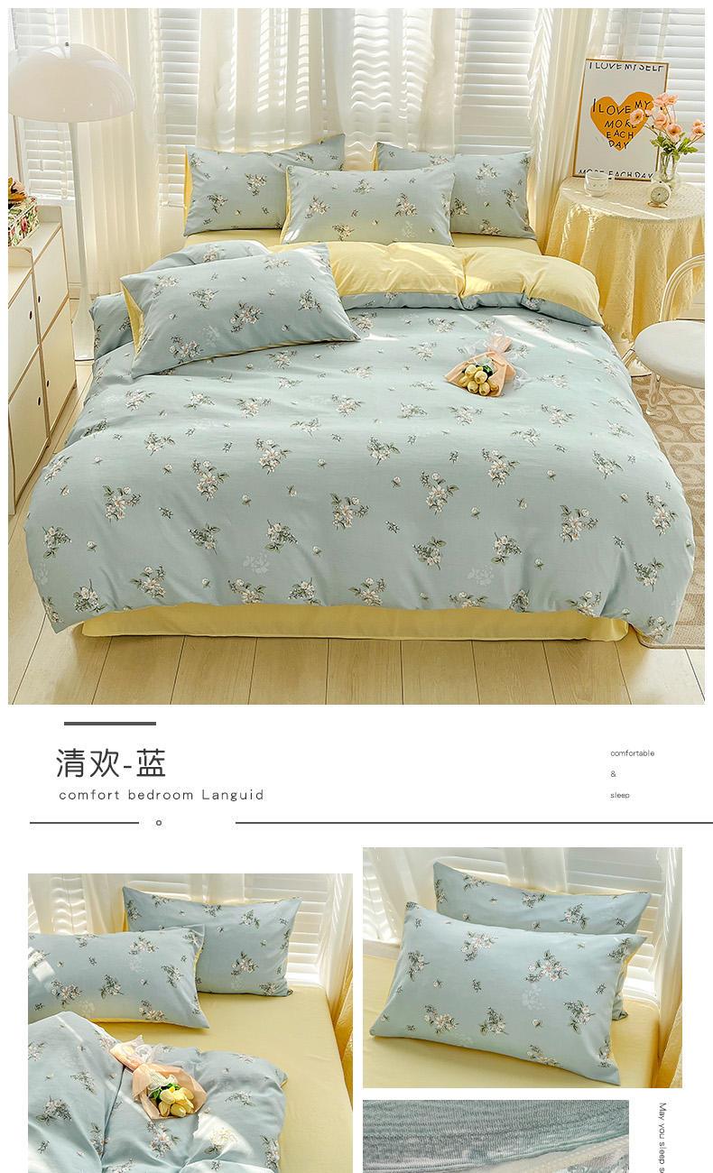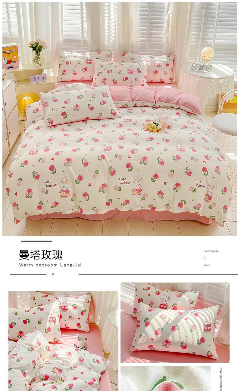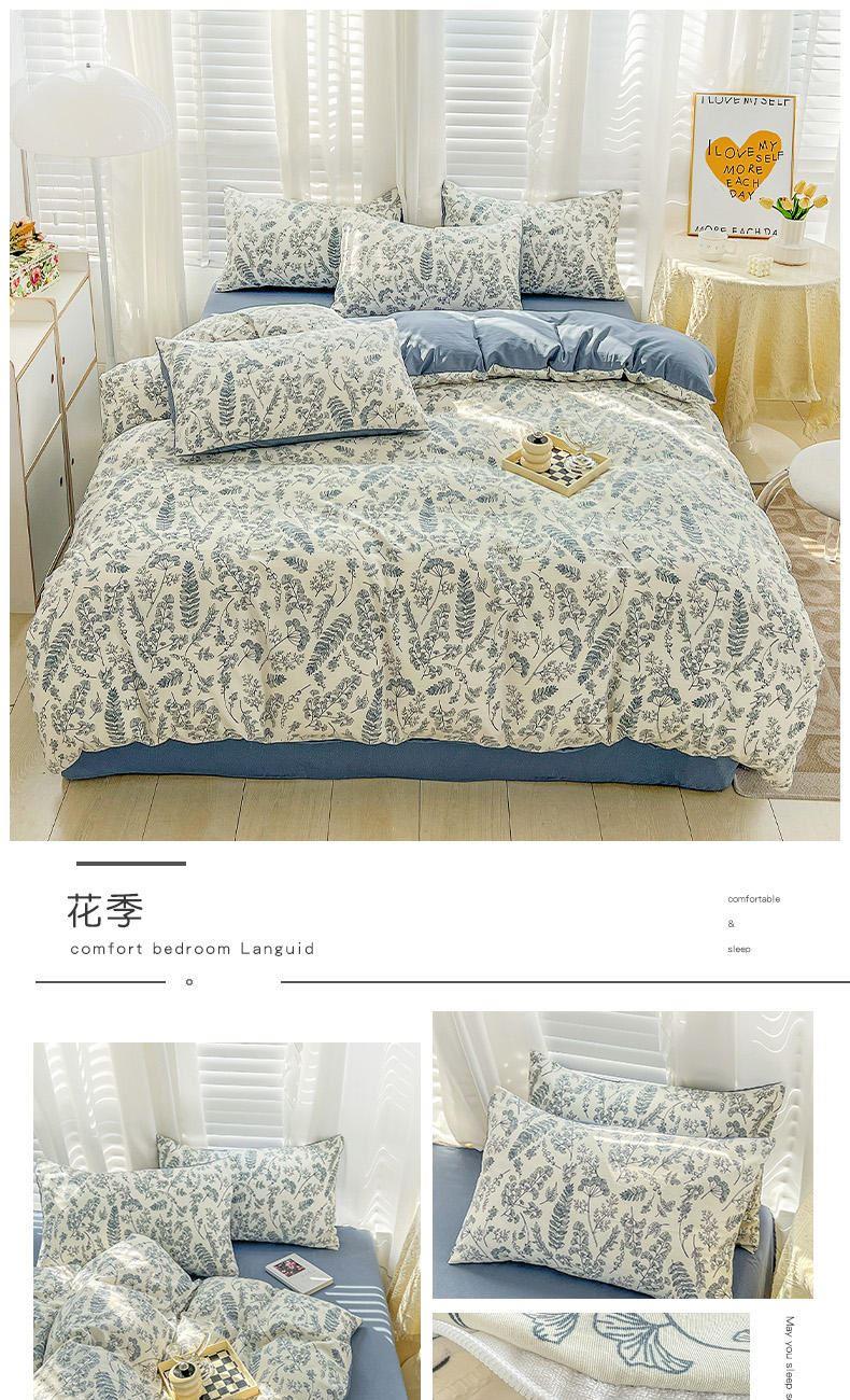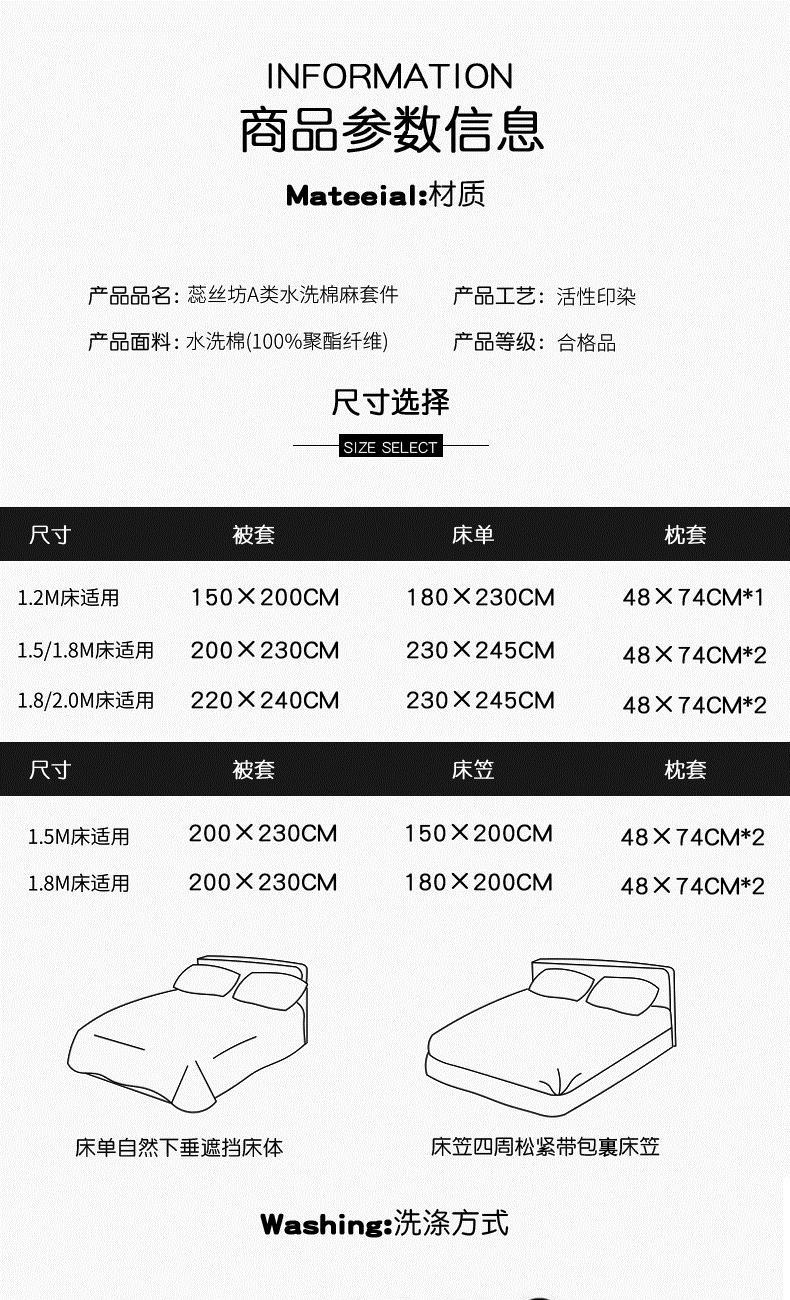 规格:被套200*230cm*1 床单230*245cm*1 枕套48*74cm*2 面料:水洗棉麻/聚酯纤维 花色:花季/花季-绿/花开半夏/花园兔/兰玫瑰/曼芮粉/曼塔玫瑰/玫瑰物语/枇杷树/清欢-蓝/四叶草-黄/微微安/维亚/小熊院长/云深茶白 法式小清新印花,面料A类棉麻水洗棉,柔软透气,软糯贴身拒绝僵硬手感,贴肤透气,细腻绵软,时尚AB双面设计,活性印染色牢度高不易褪色,不易起球,久洗如新!细致做工,内里欧式锁边,尽显匠心工艺,隐形拉链贴心系带
