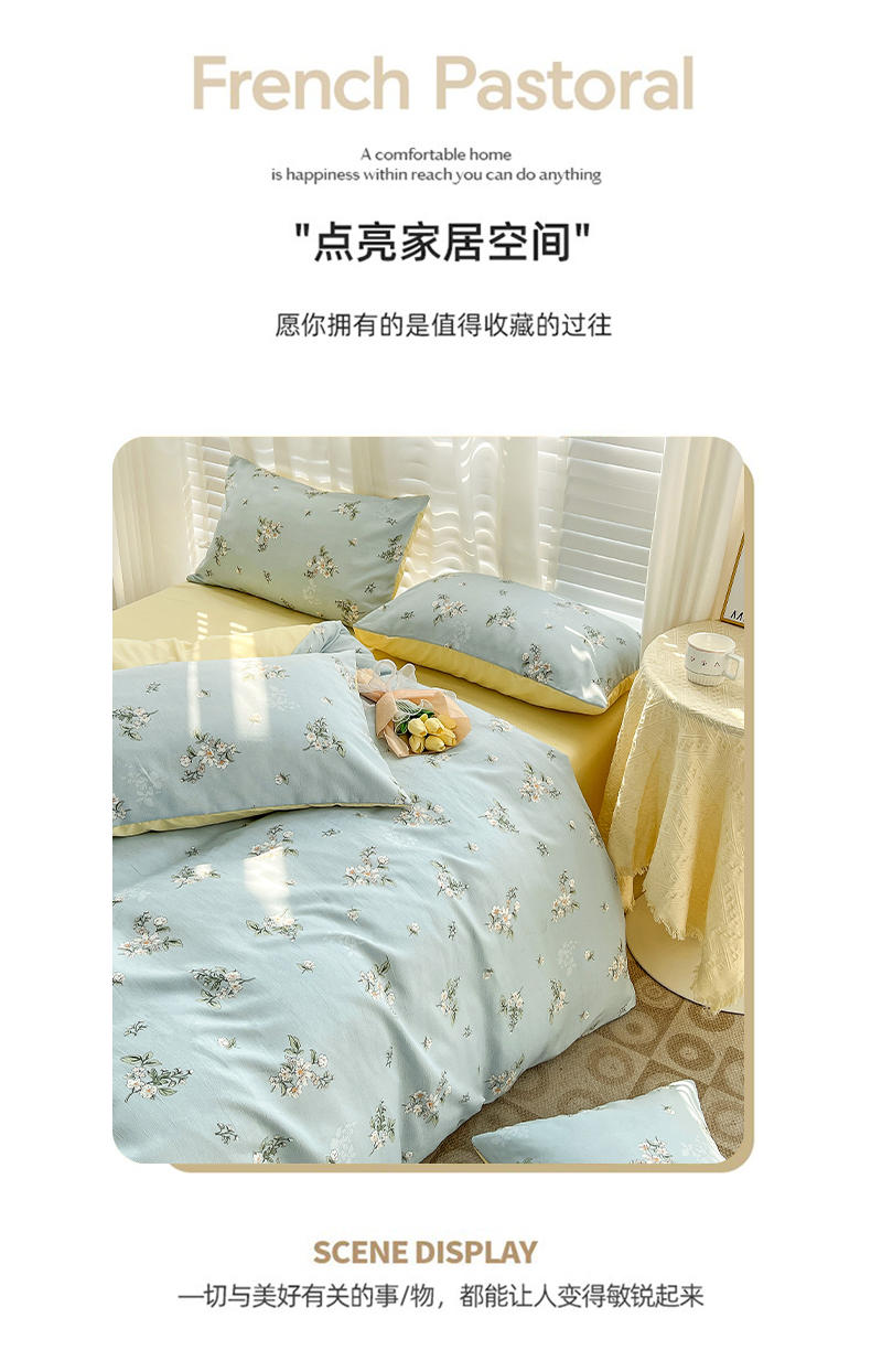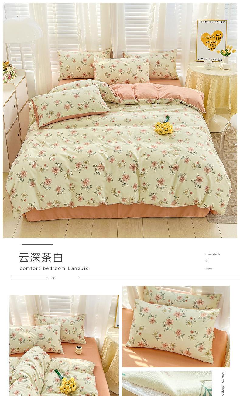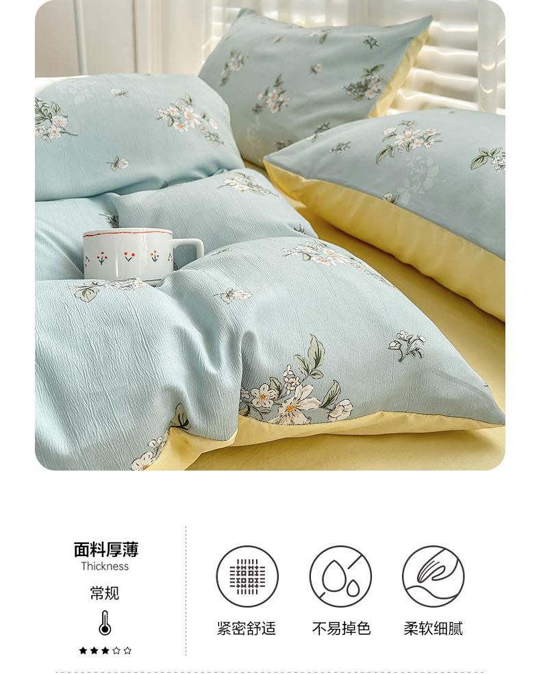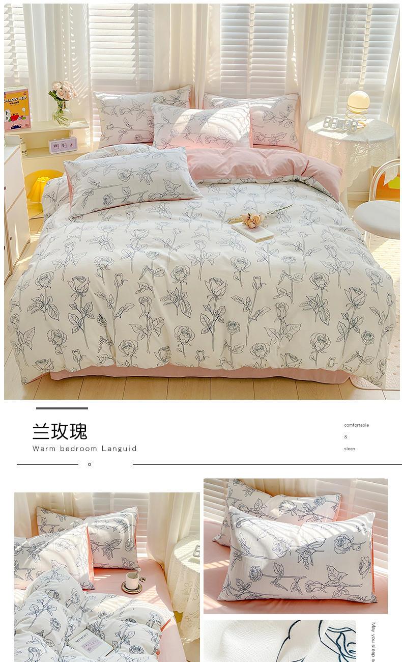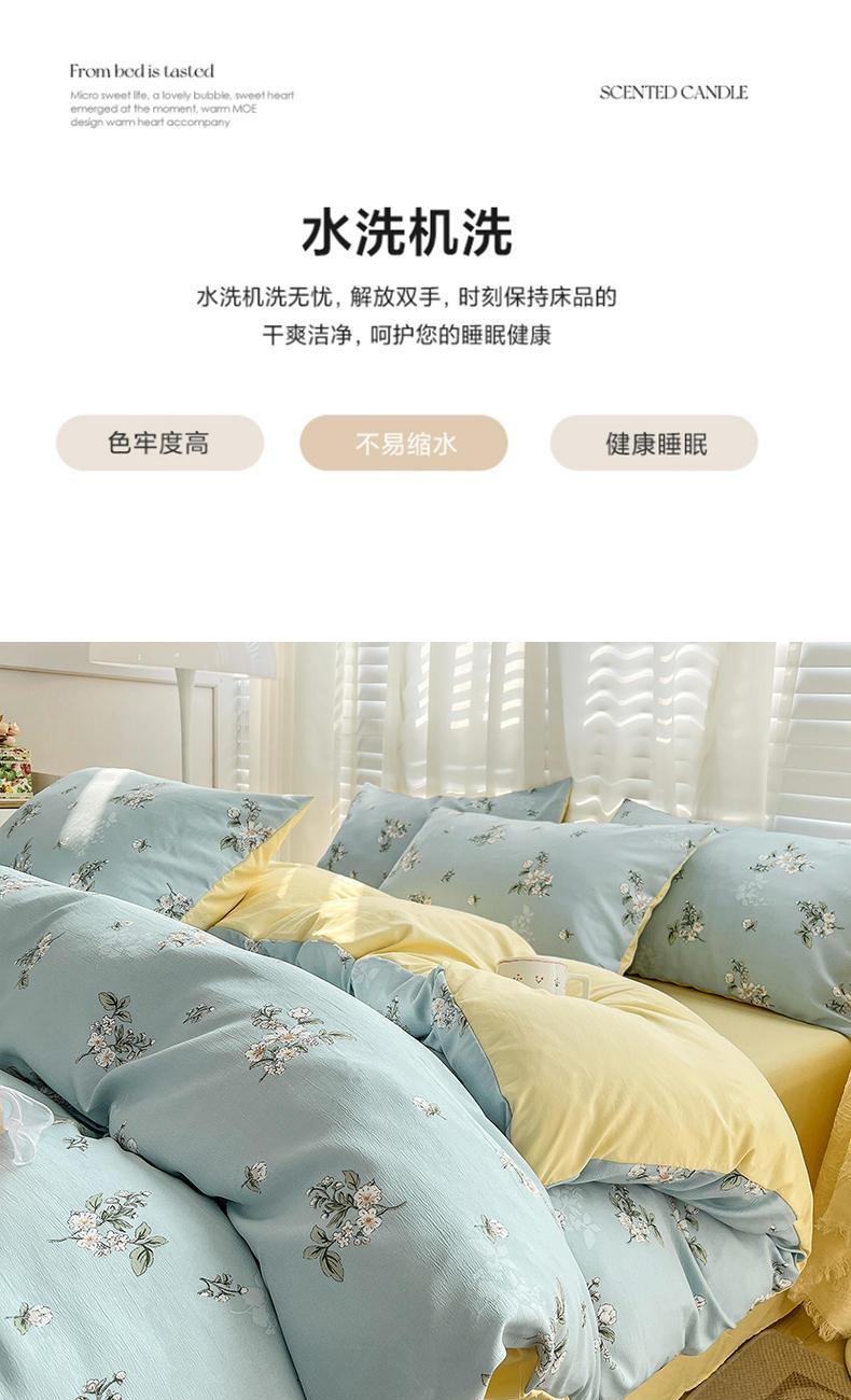 规格:被套200*230cm*1 床单230*245cm*1 枕套48*74cm*2 面料:水洗棉麻/聚酯纤维 花色:花季/花季-绿/花开半夏/花园兔/兰玫瑰/曼芮粉/曼塔玫瑰/玫瑰物语/枇杷树/清欢-蓝/四叶草-黄/微微安/维亚/小熊院长/云深茶白 法式小清新印花,面料A类棉麻水洗棉,柔软透气,软糯贴身拒绝僵硬手感,贴肤透气,细腻绵软,时尚AB双面设计,活性印染色牢度高不易褪色,不易起球,久洗如新!细致做工,内里欧式锁边,尽显匠心工艺,隐形拉链贴心系带